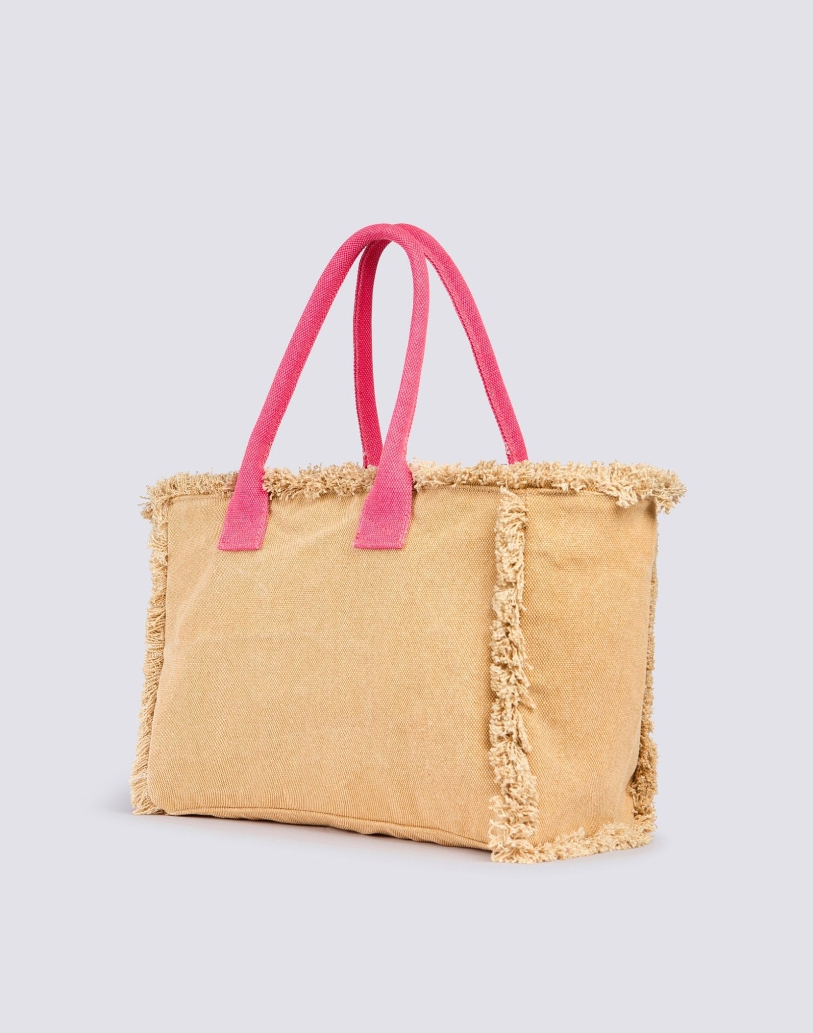 Shopping bag con frange, logo stampato fronte, chiusura con zip e tasca interna.