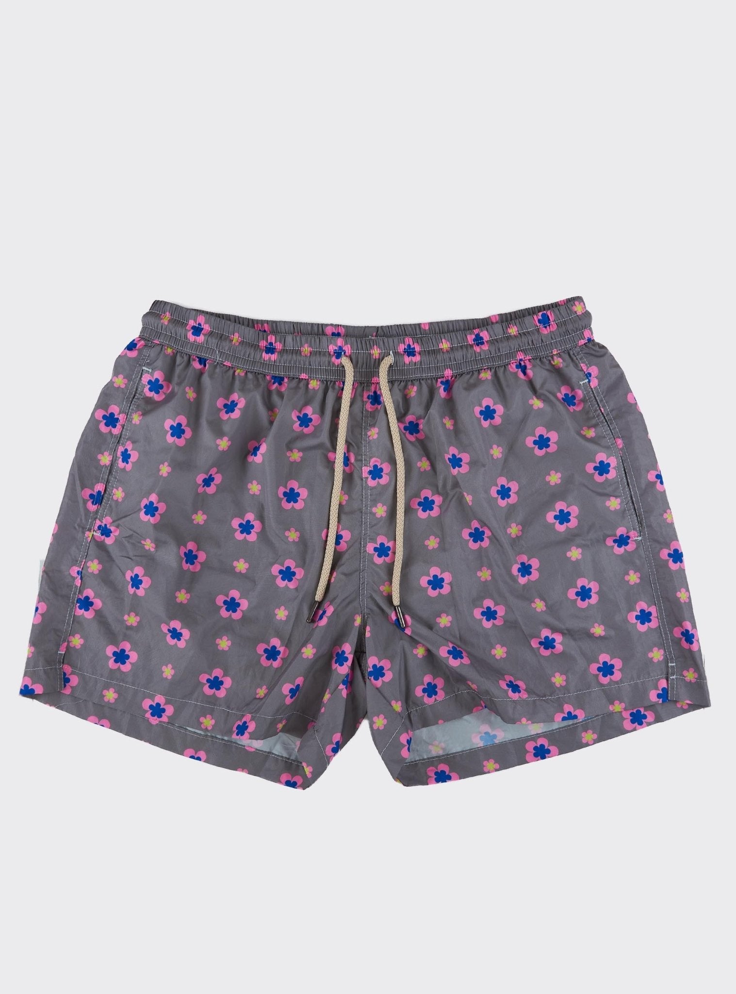 Swimsuit Fefè Napoli Model MPA FLOWERS GRAY - short. Special Made in Italy fabric very soft to the touch with a drying capacity four times higher than the average. Elasticated waist, double side welt pocket, pocket with Velcro closure on the back and internal mesh.