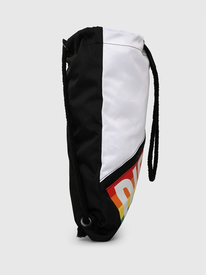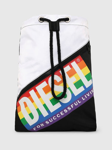 Drawstring, rainbow Diesel logo, made of technical fabric, with zip pocket on the front.