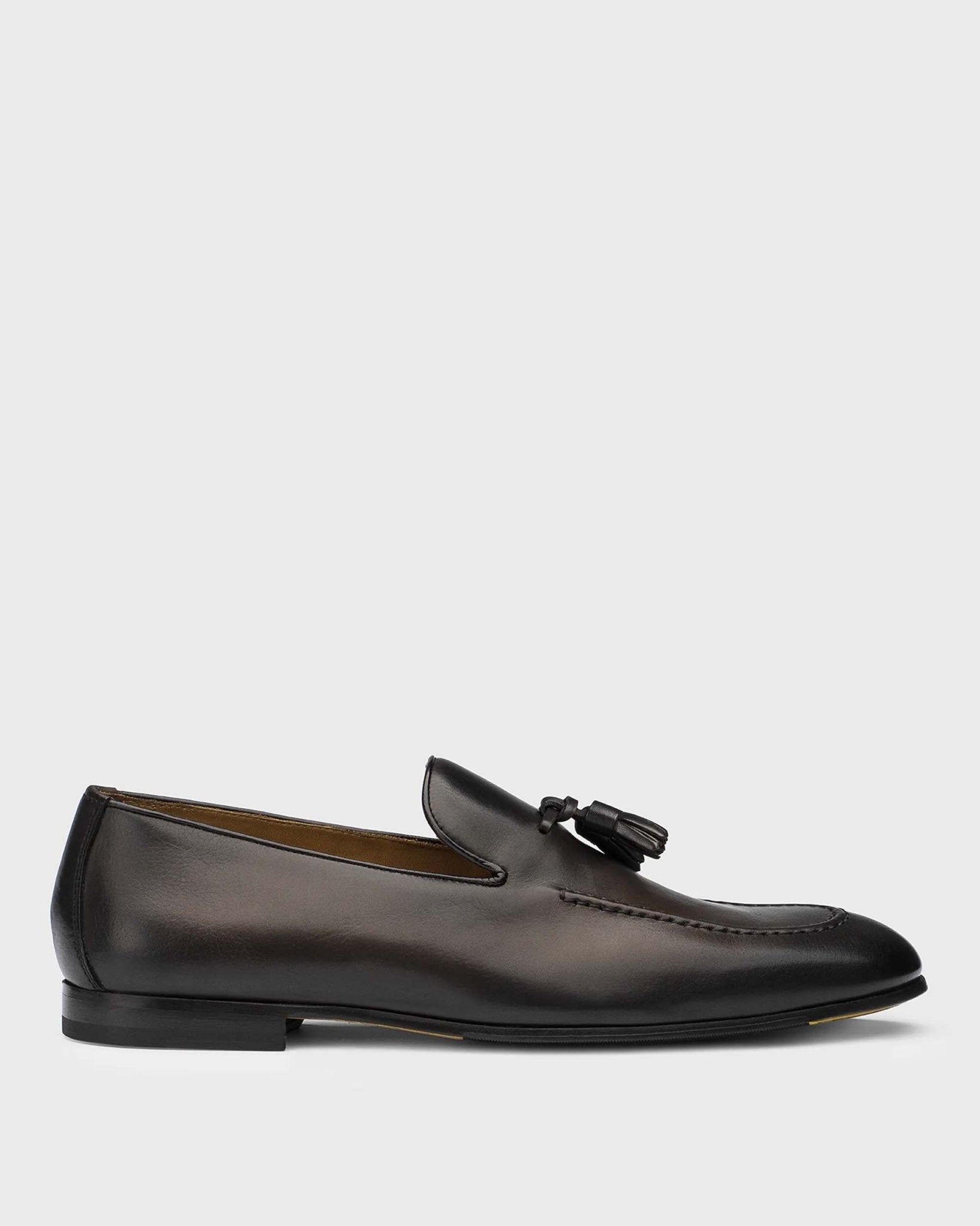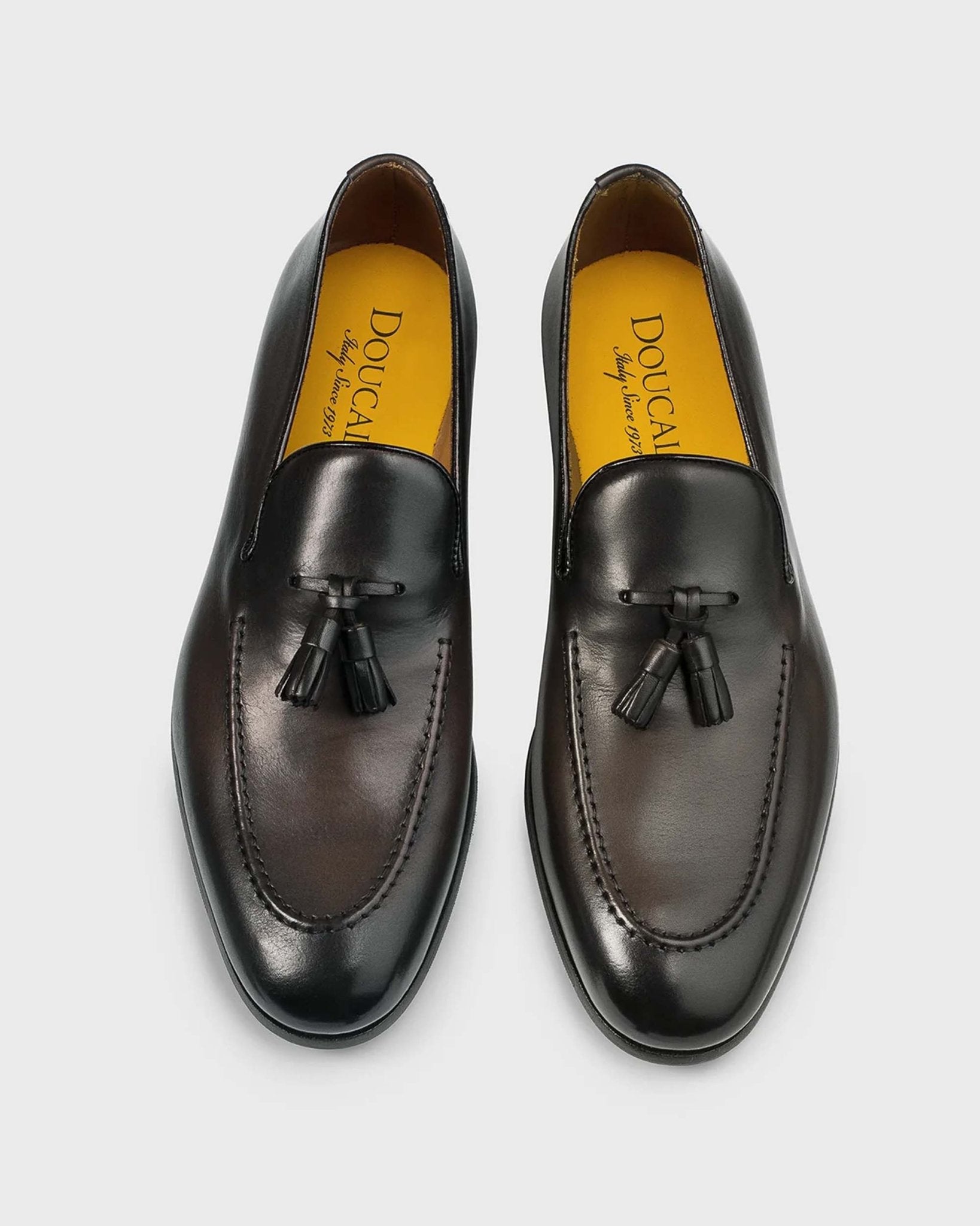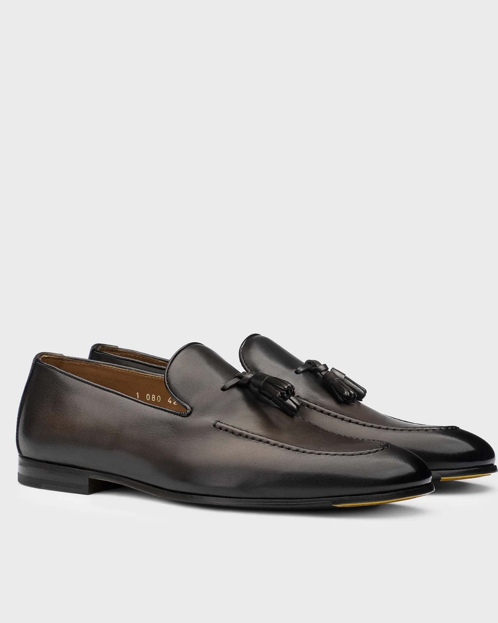 Mocassini in pelle testa di moro, con nappine tono su tono. La lavorazione Blake rende la scarpa resistente e morbida nella calzata, suola in cuoio nell'iconico giallo Golden Cream con mezza piantina in gomma.