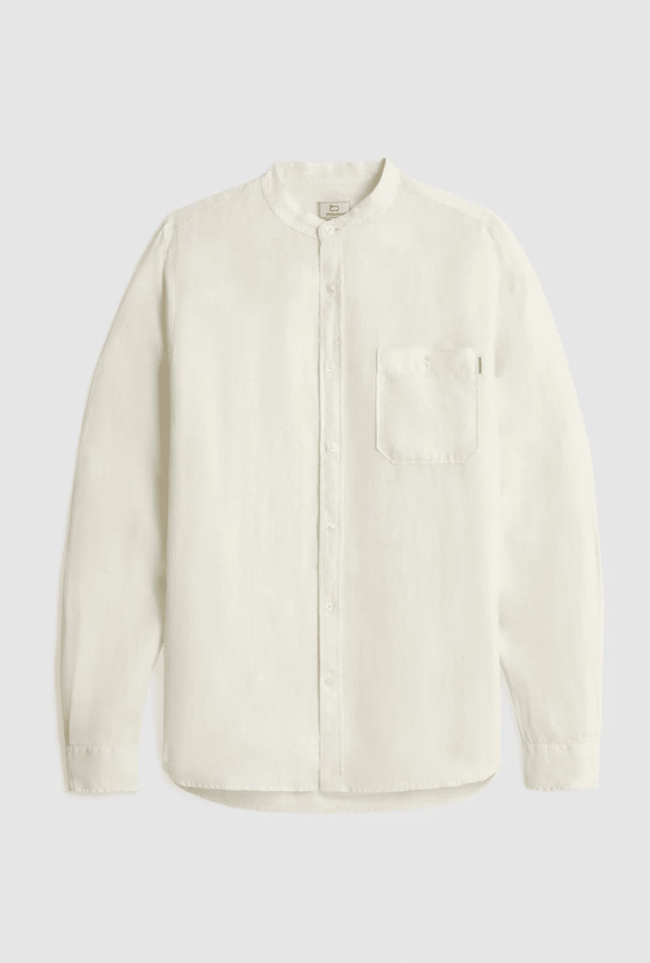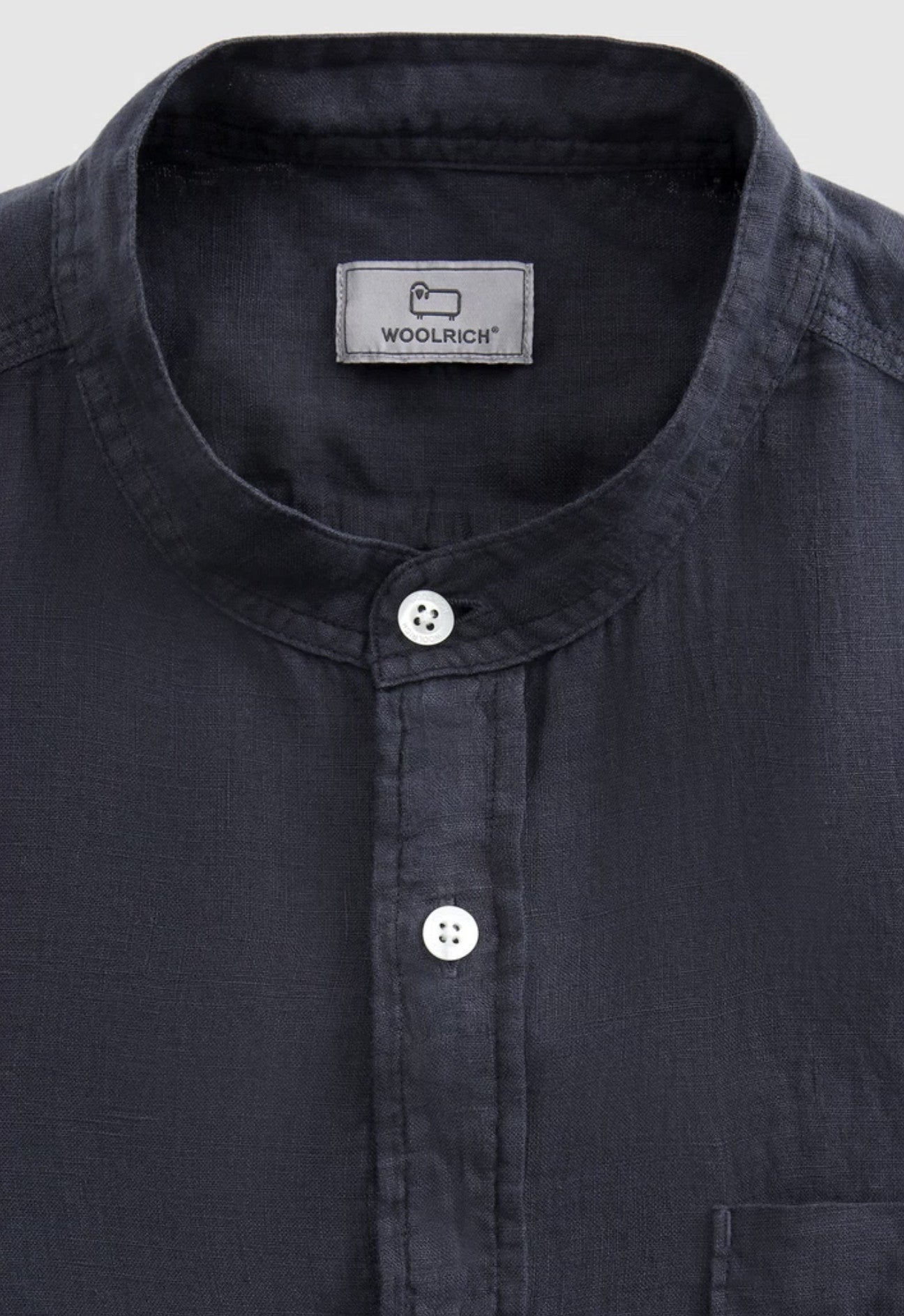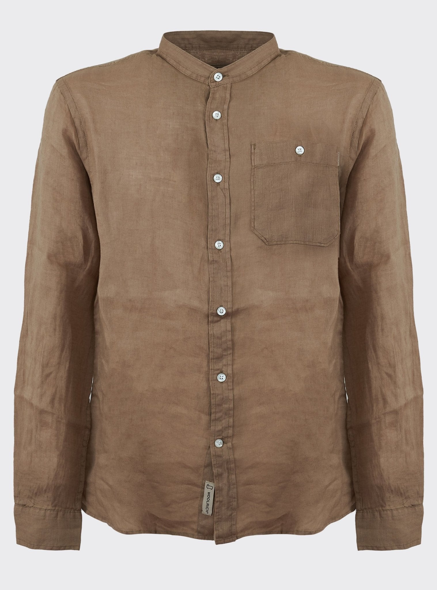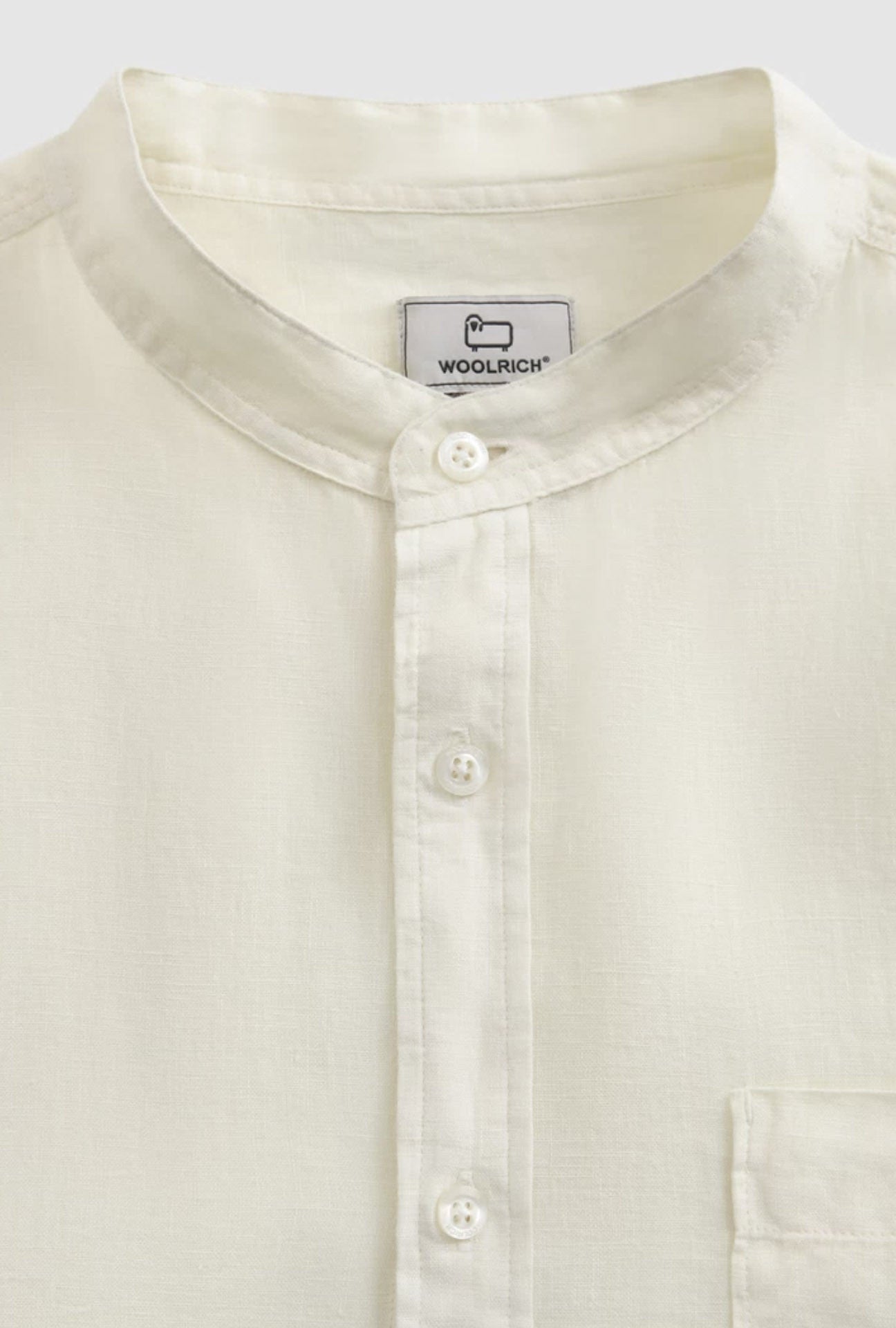 100% linen, mandarin collar, button closure, chest pocket and Woolrich logo on the inside flap.