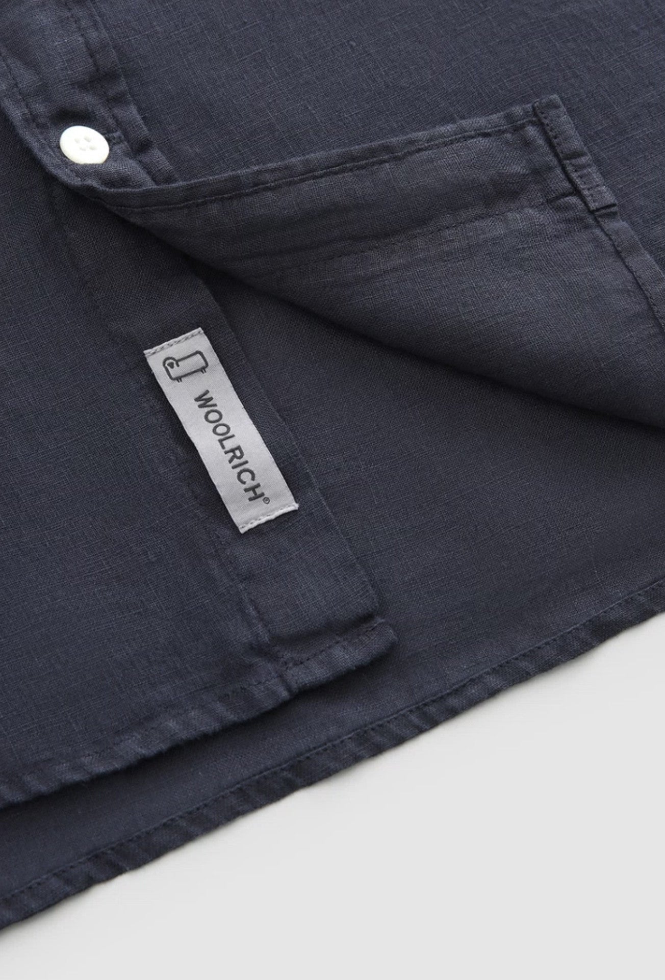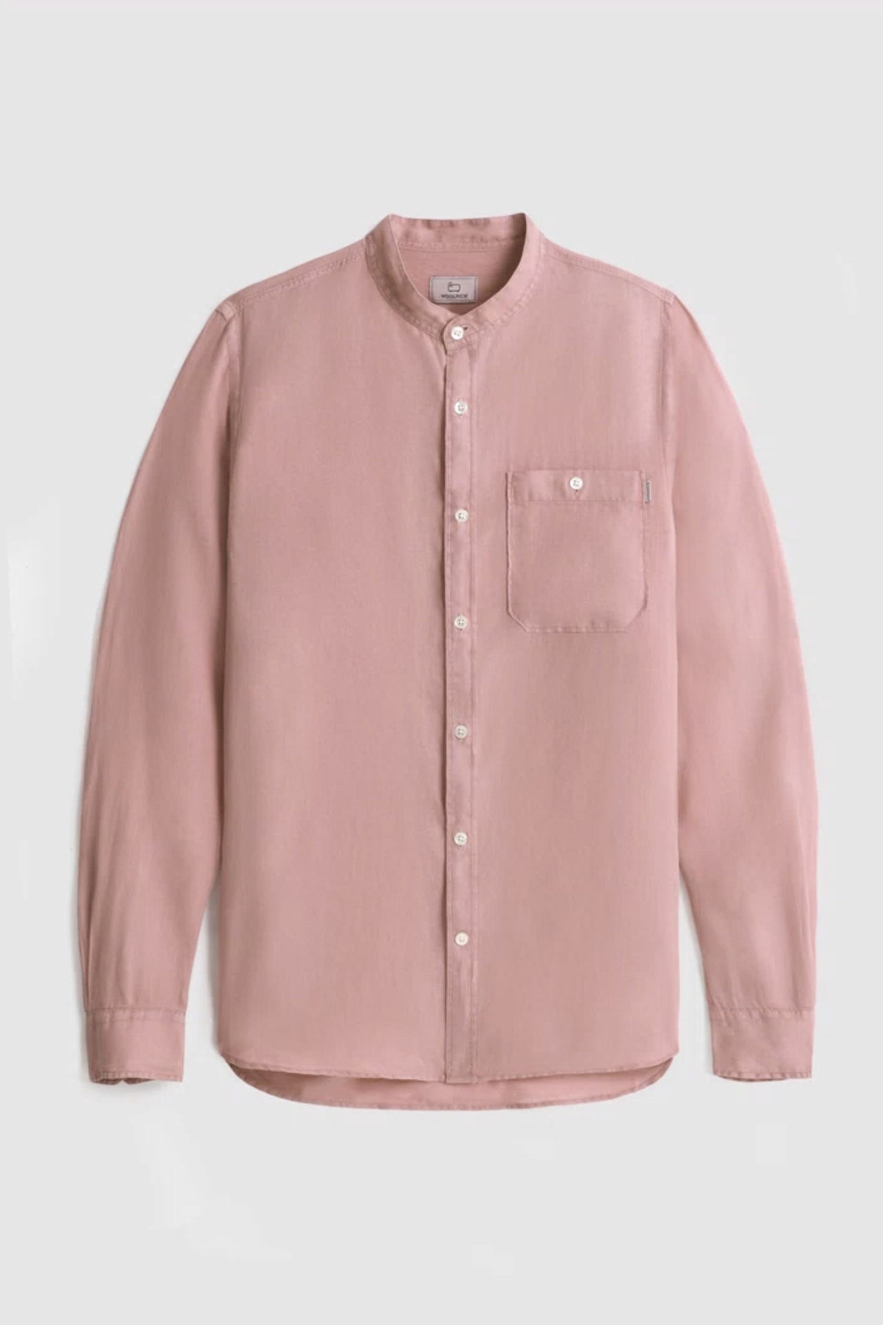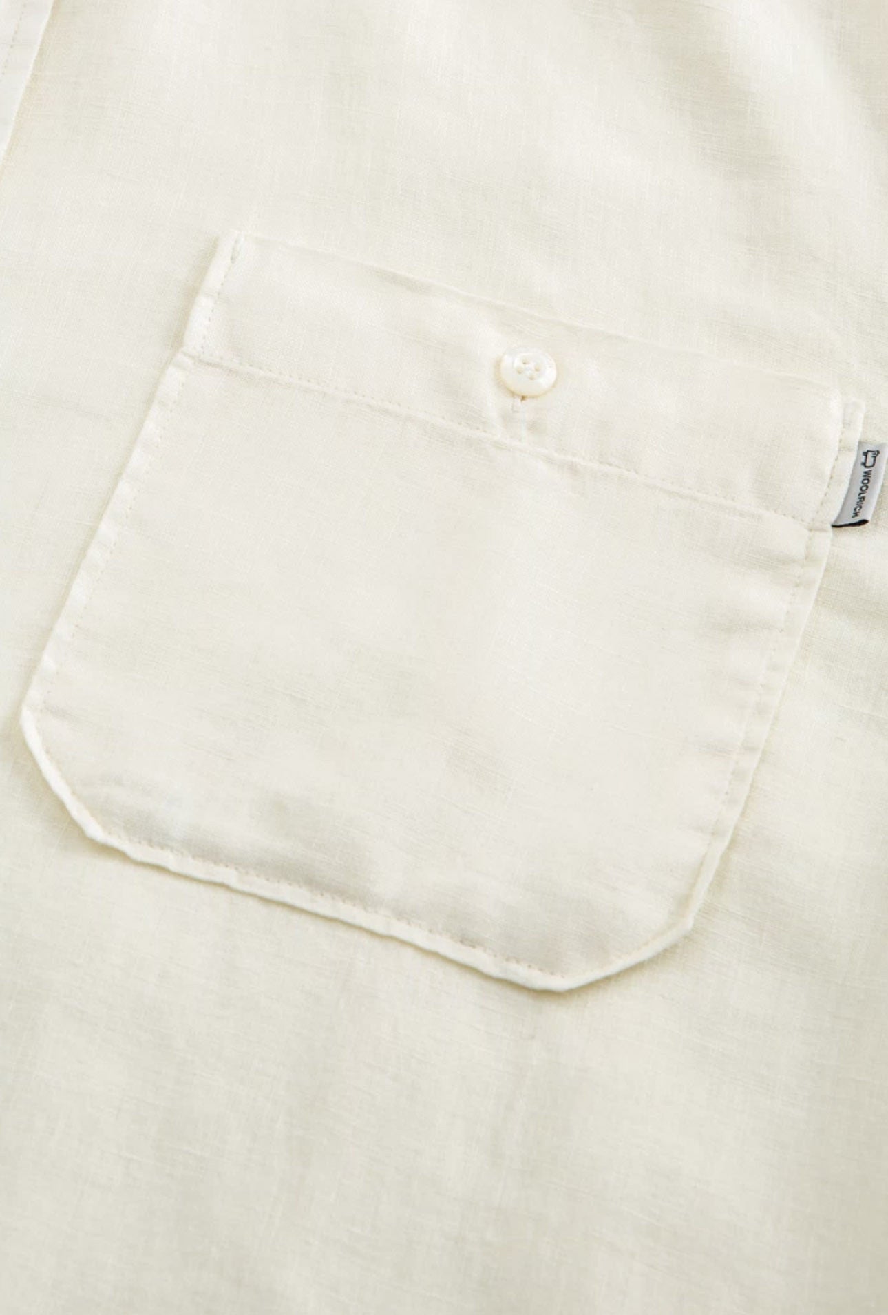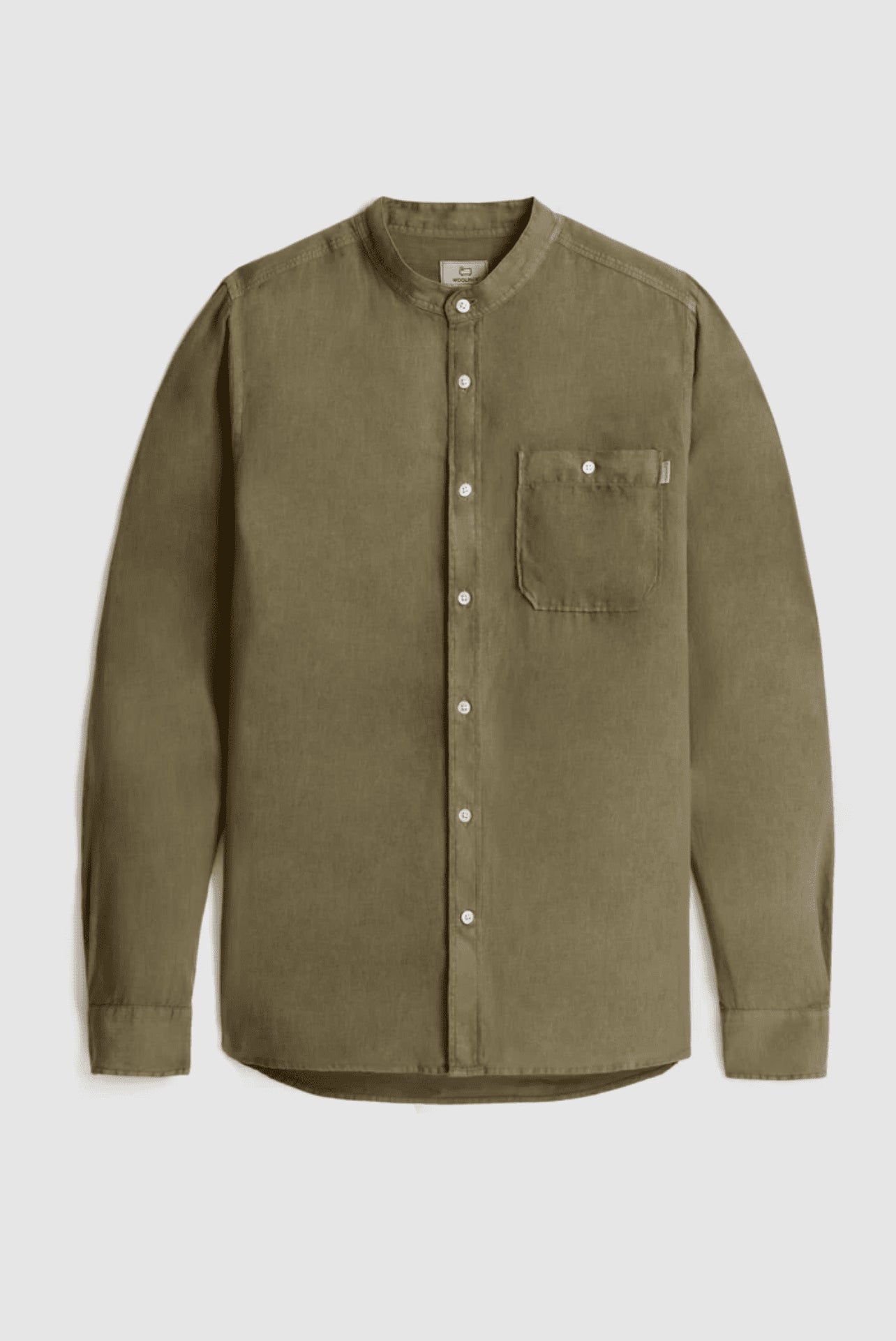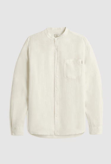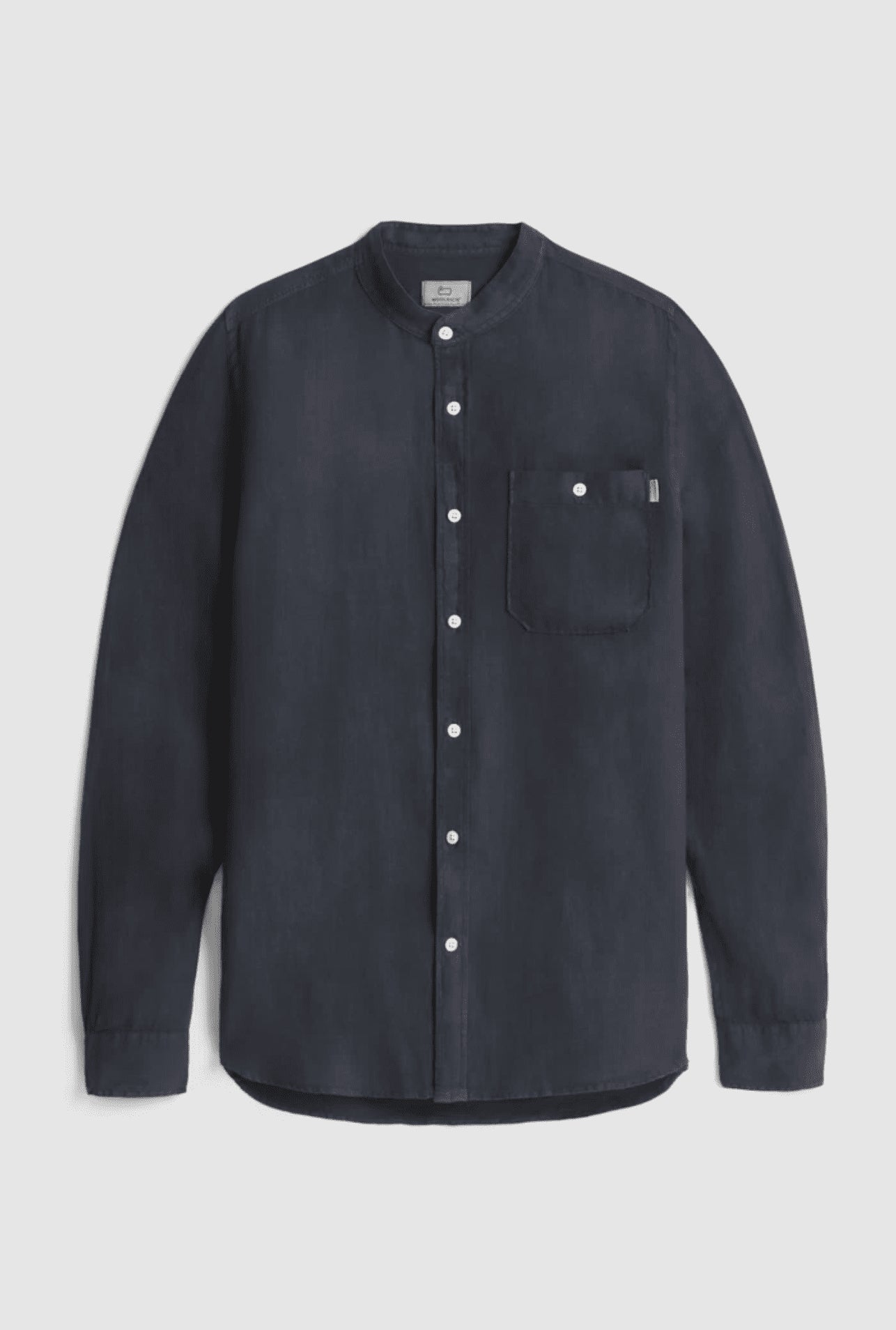 100% linen, mandarin collar, button closure, chest pocket and Woolrich logo on the inside flap.