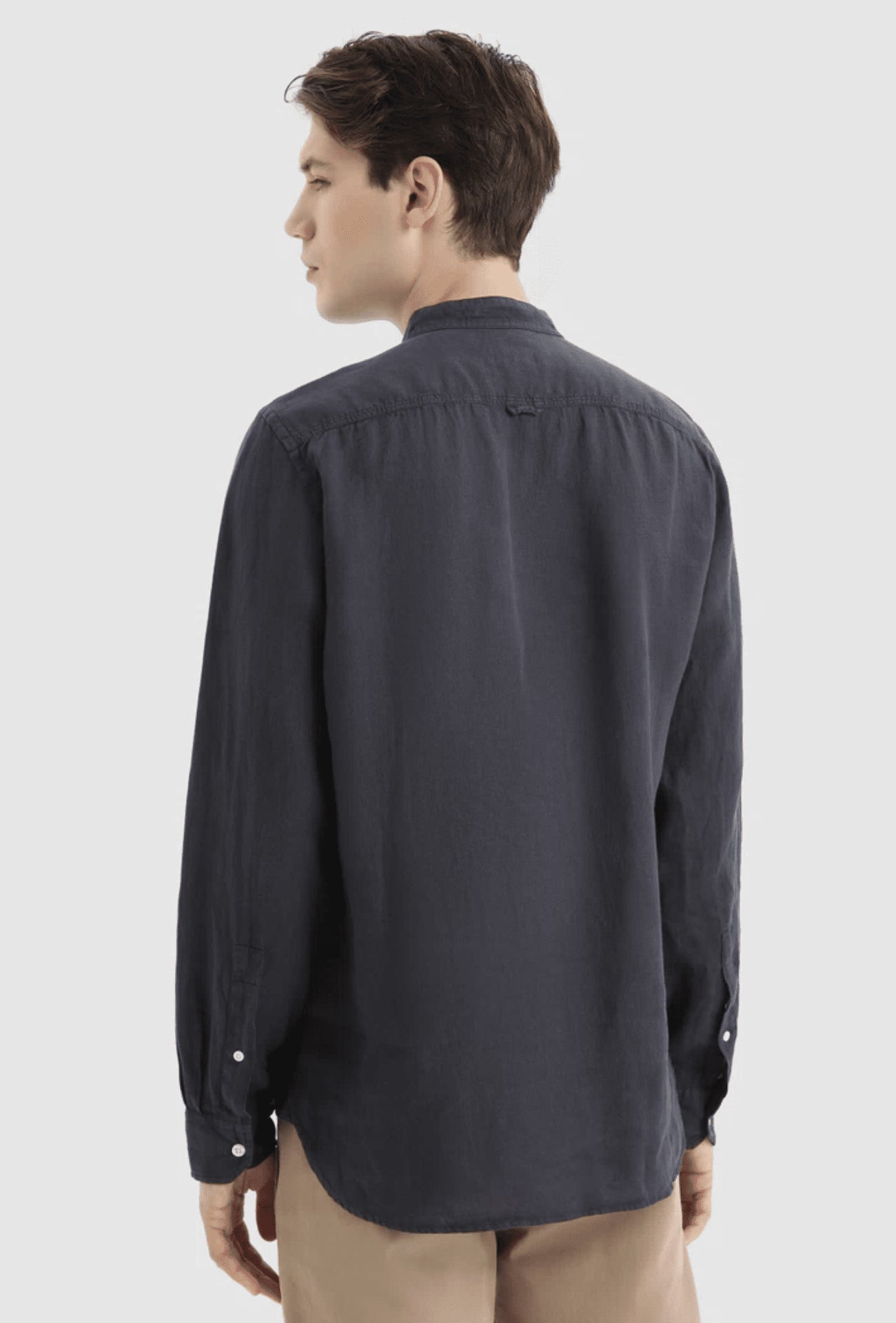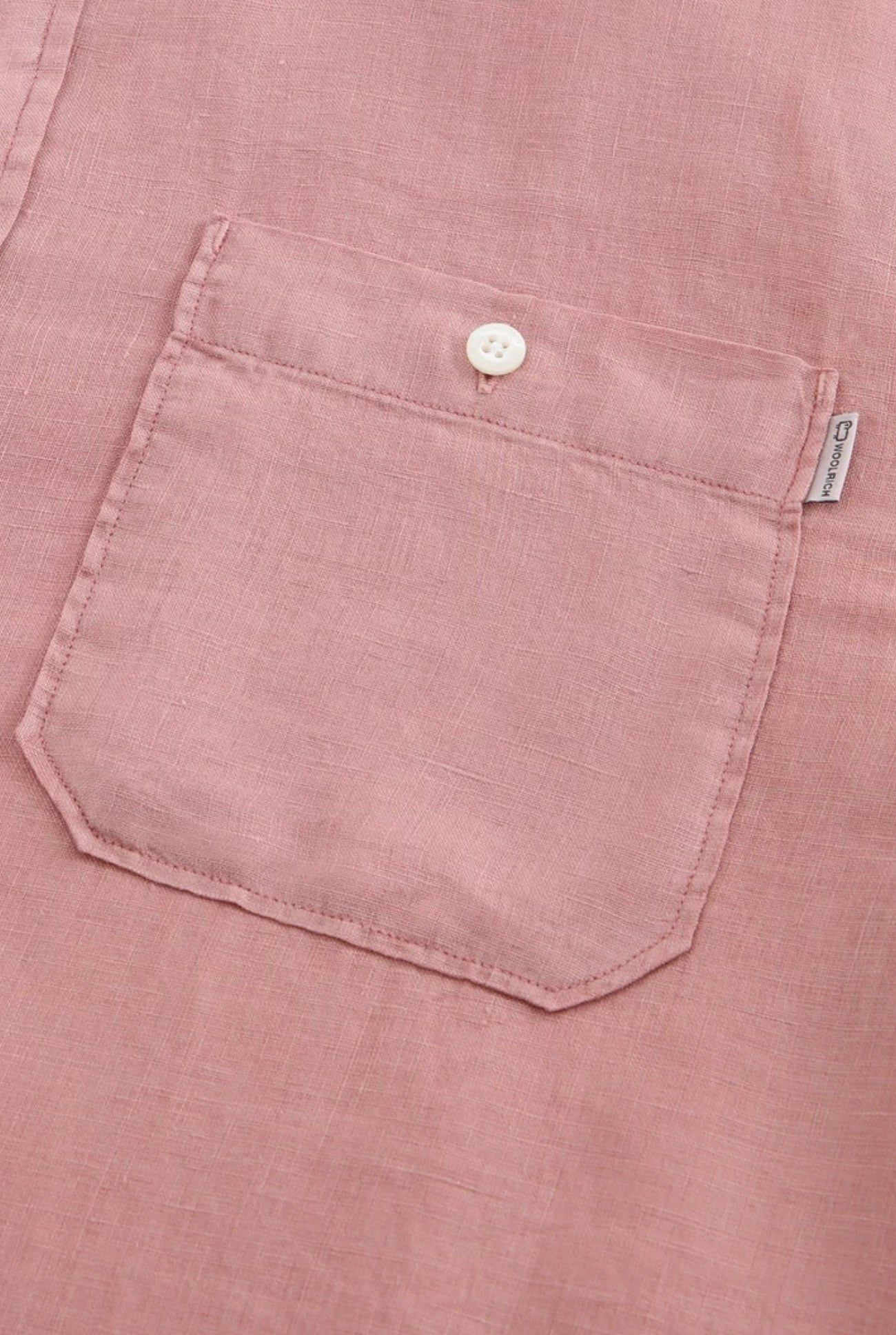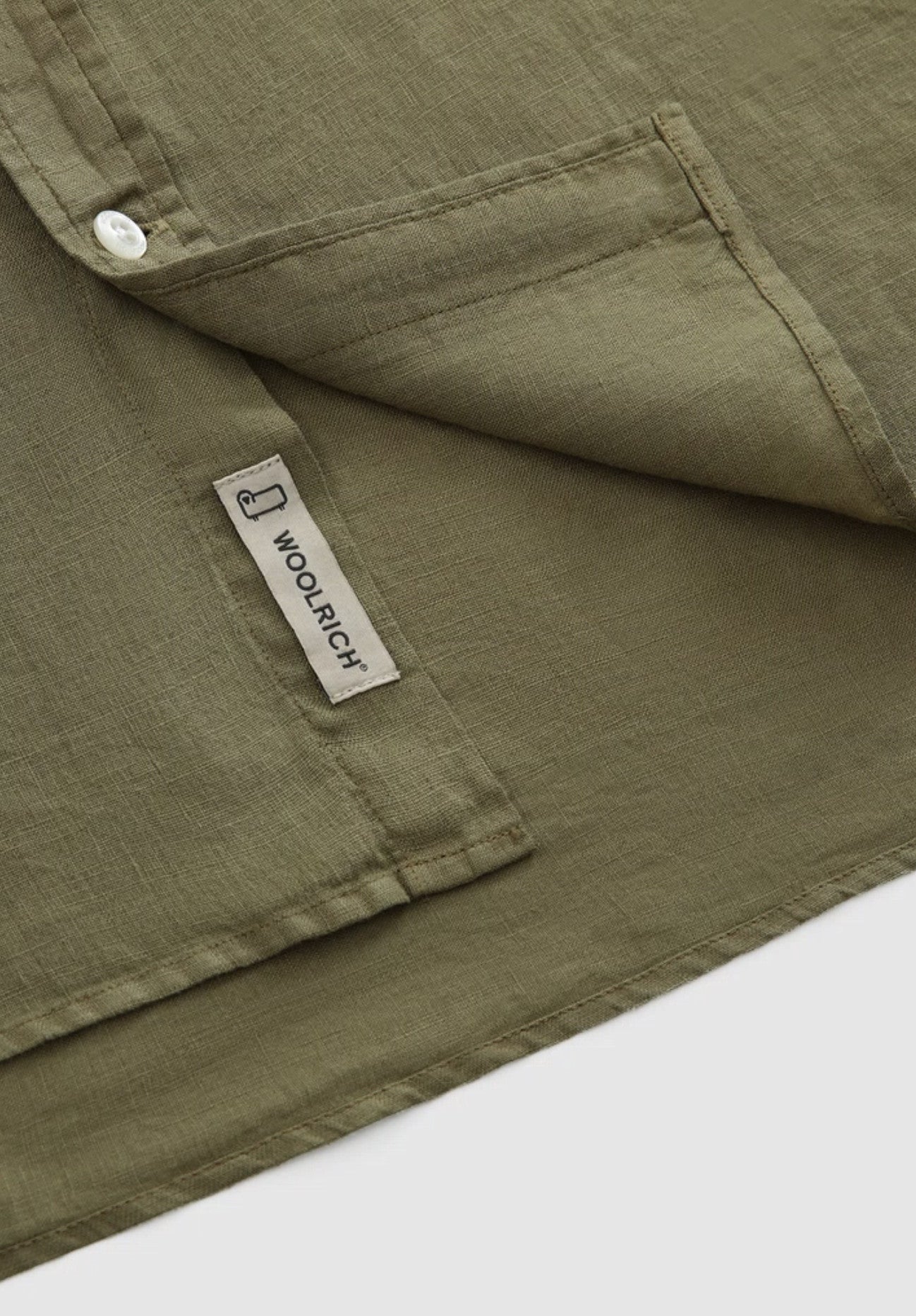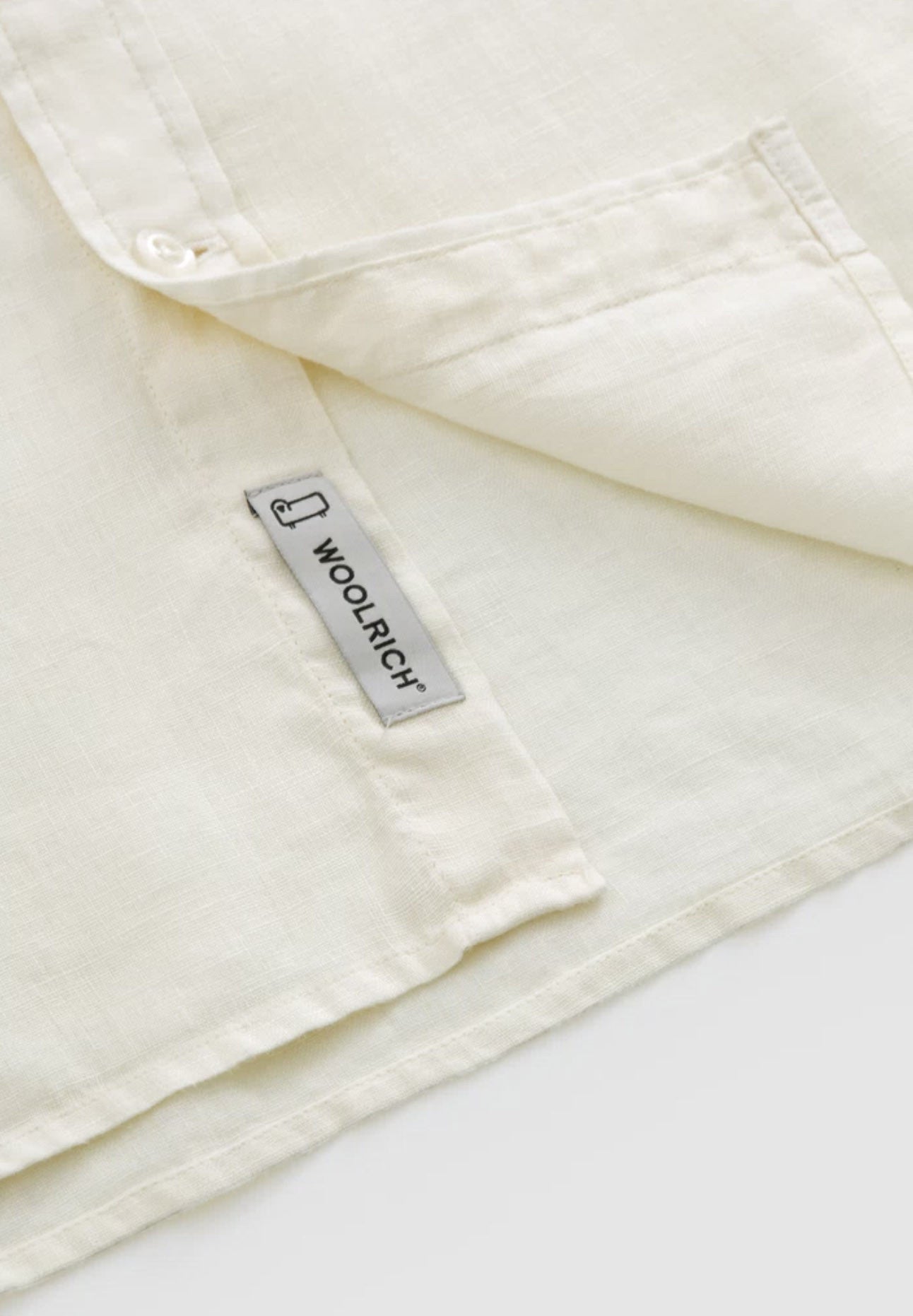 100% linen, mandarin collar, button closure, chest pocket and Woolrich logo on the inside flap.