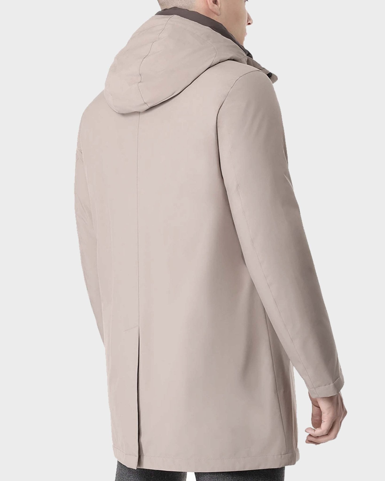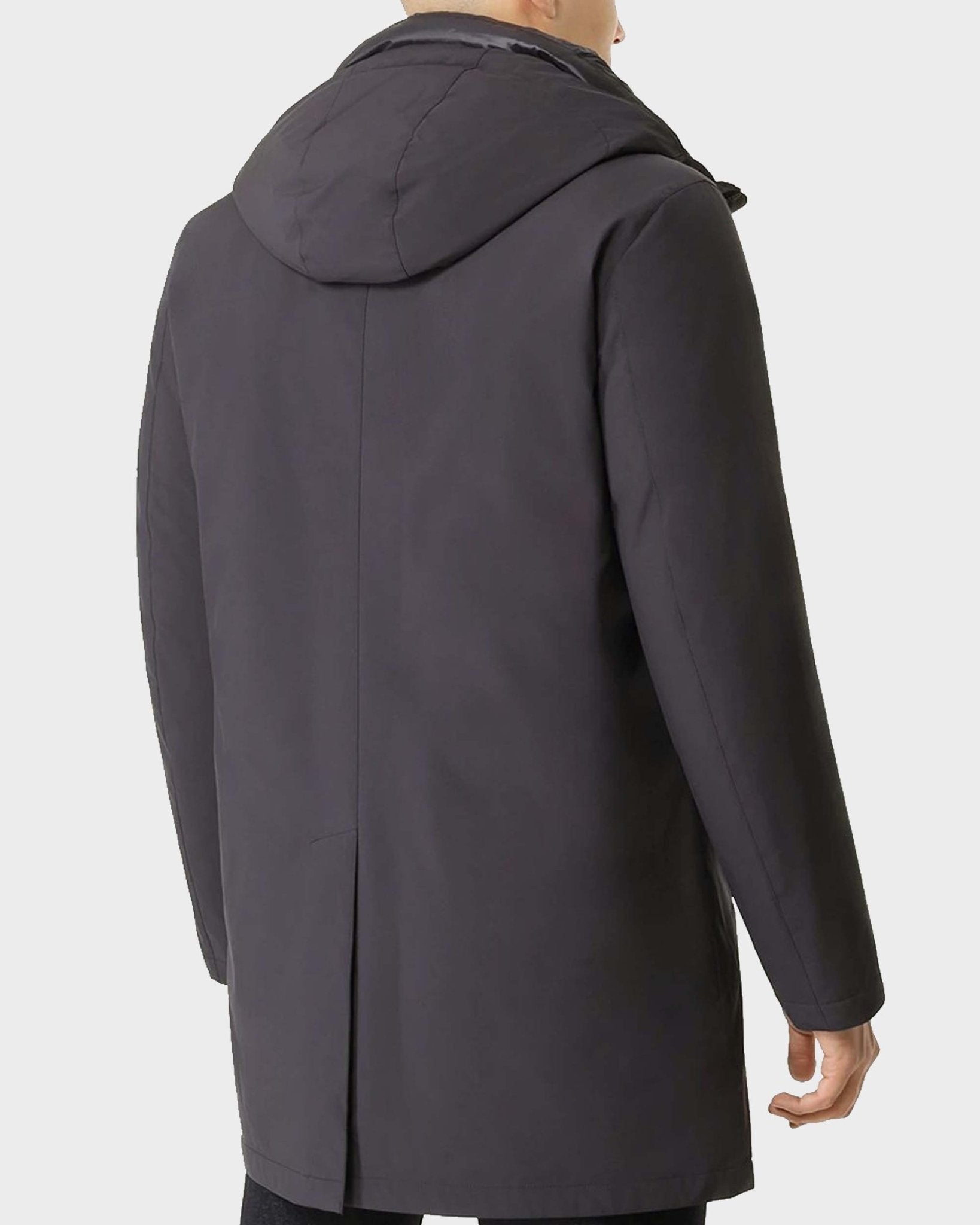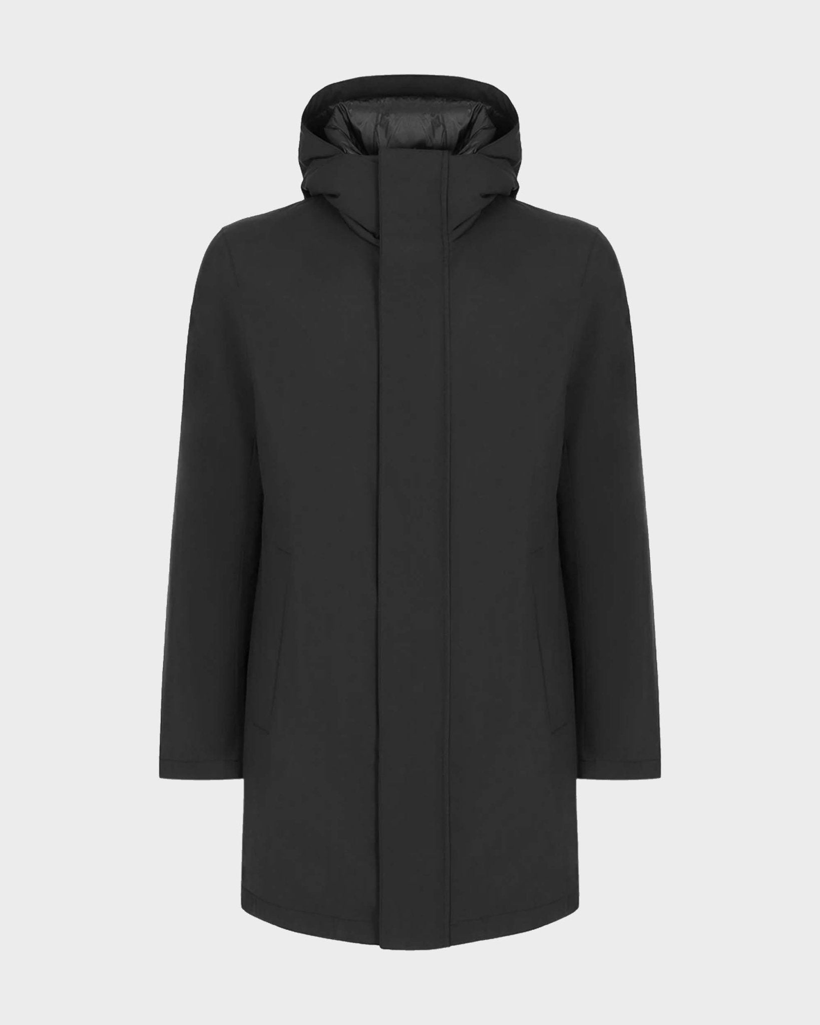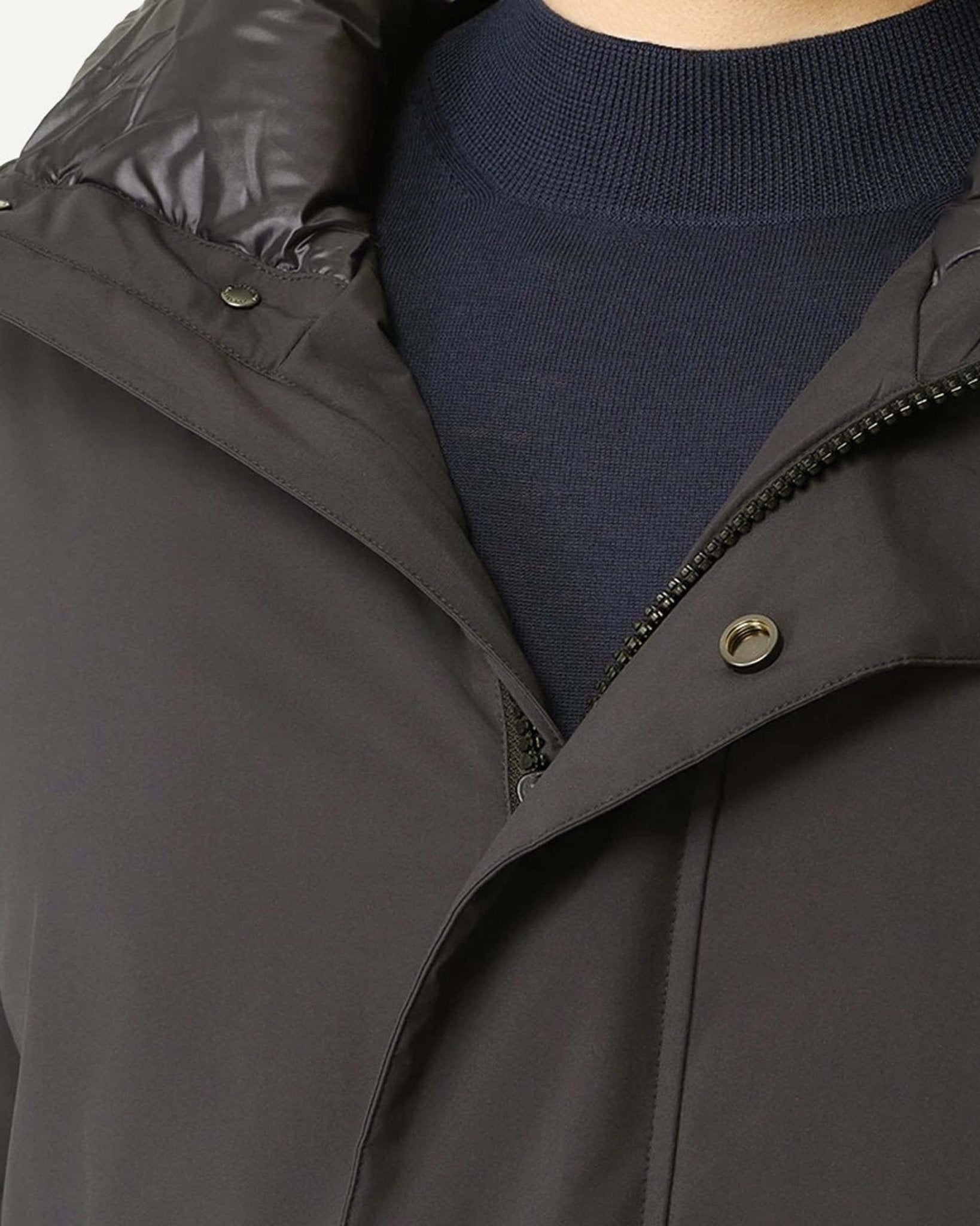 Chiusura con zip nascosta doppio cursore e bottoni a pressione, doppia tasca laterale, imbottitura in piuma interna e singolo spacco sul retro.