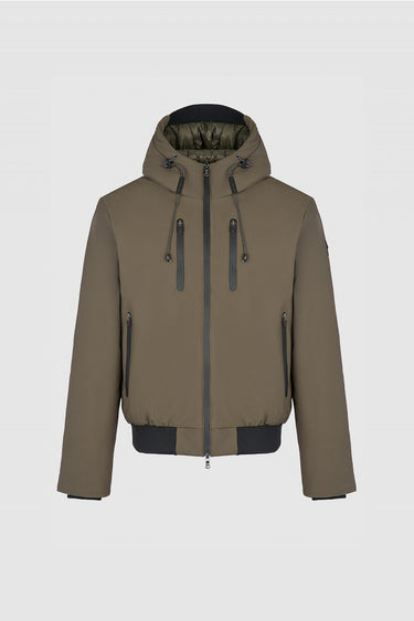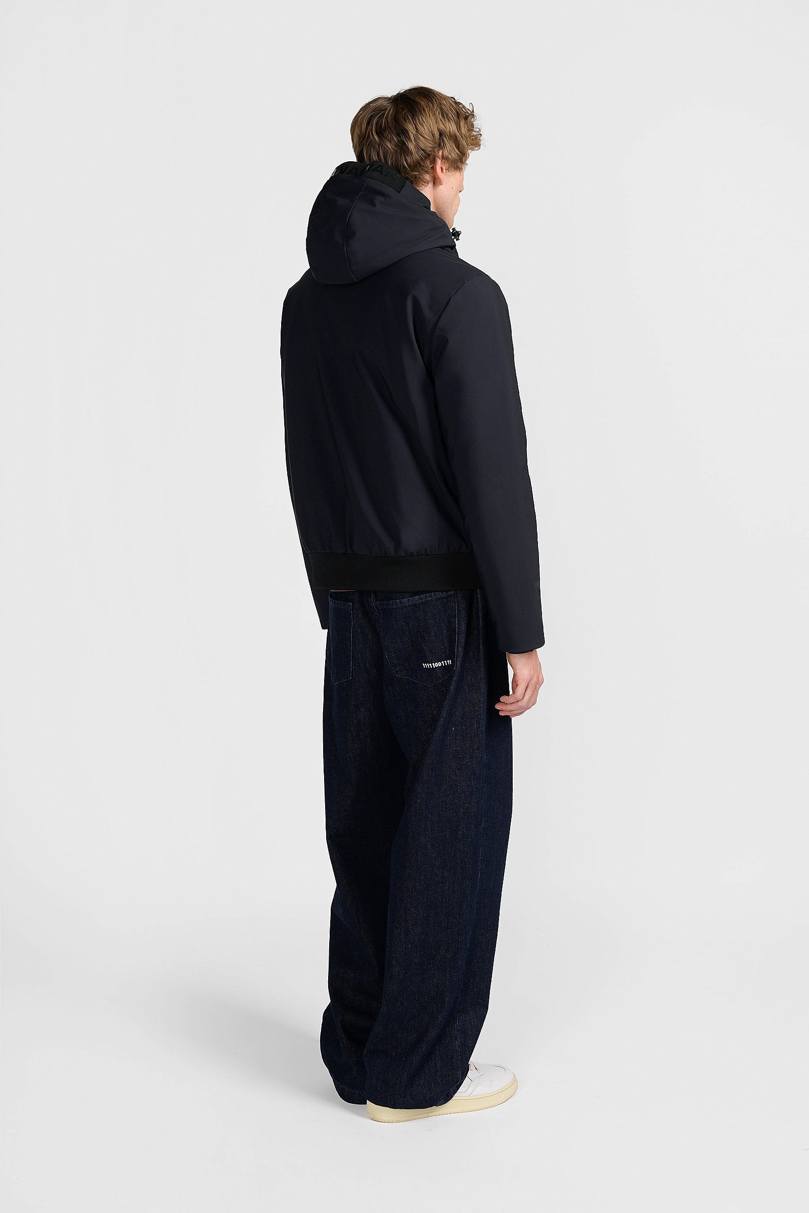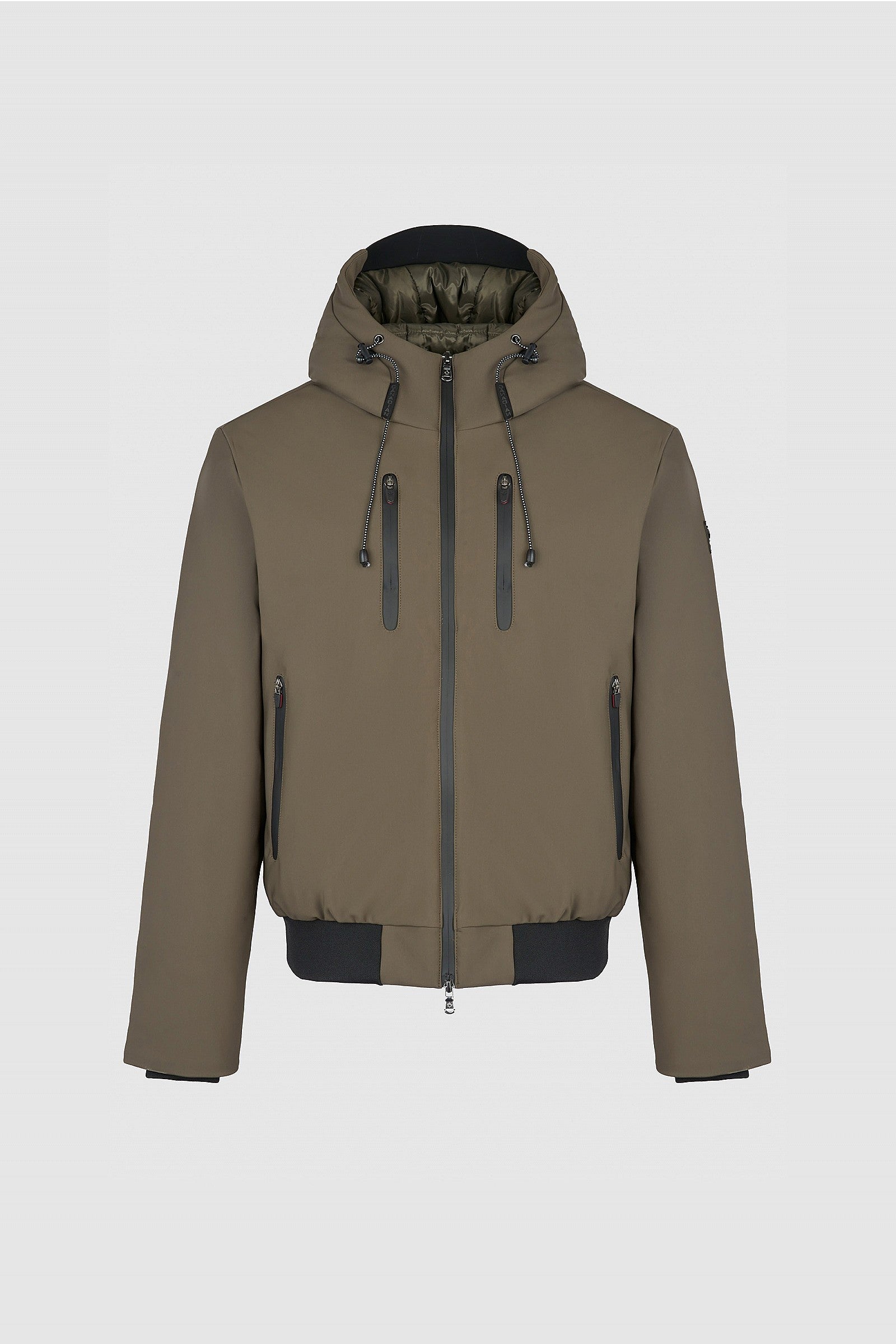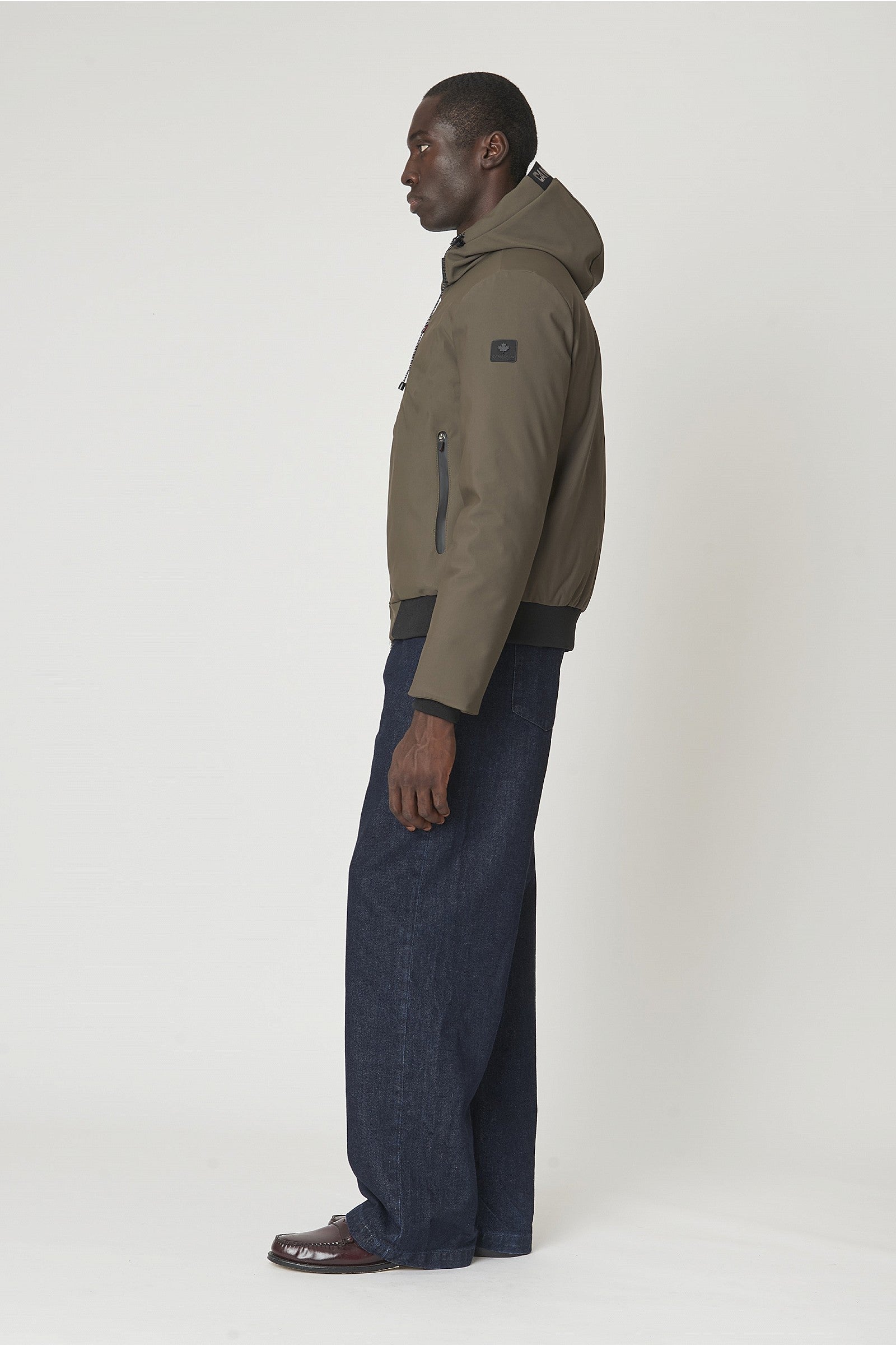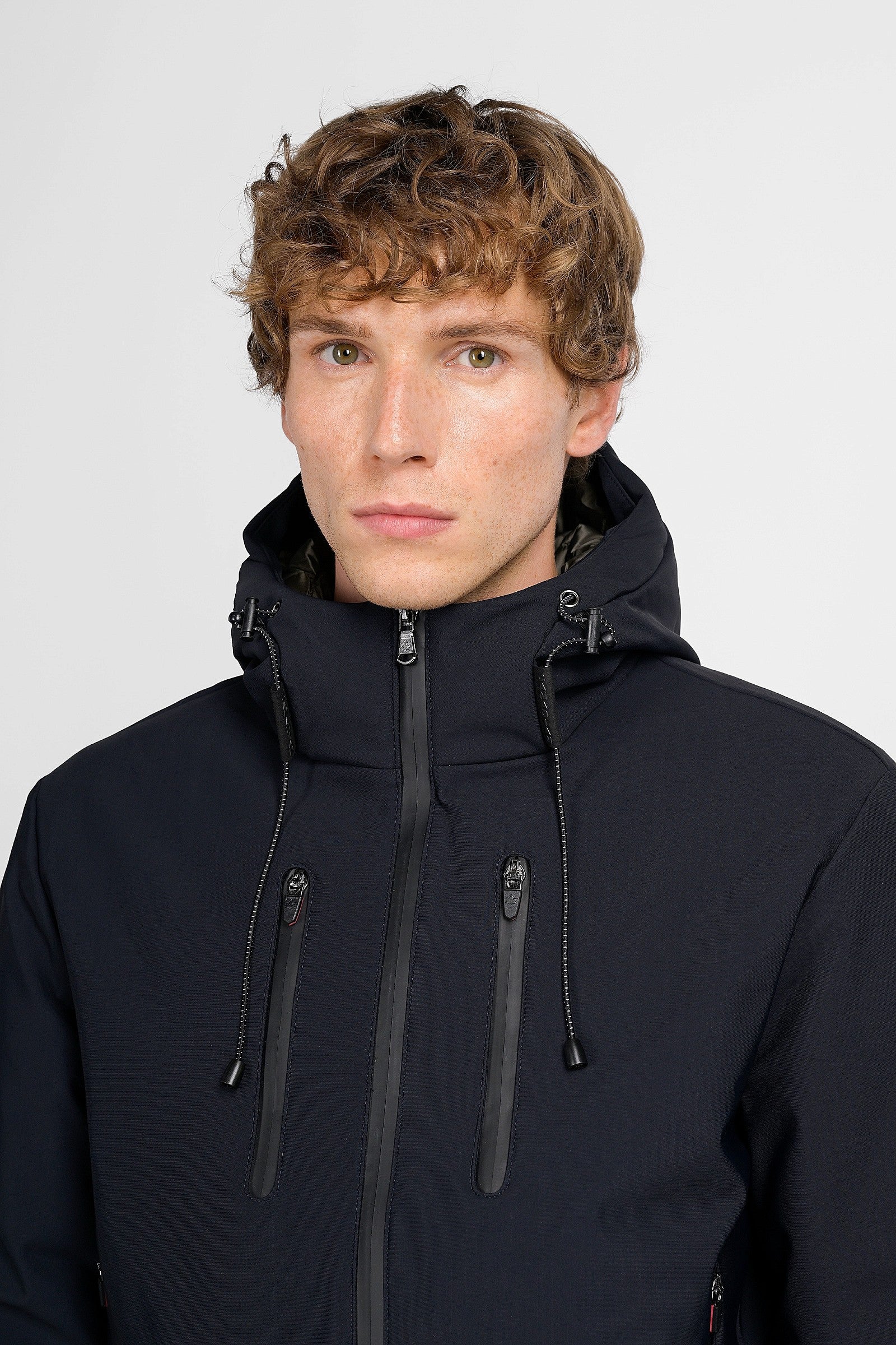 Tessuto tecnico idrorepellente e anti vento e imbottitura di poliestere per un comfort termico ideale. Cappuccio regolabile e tramite coulisse, quattro tasche con zip, inserto orlo e polsini in maglia.