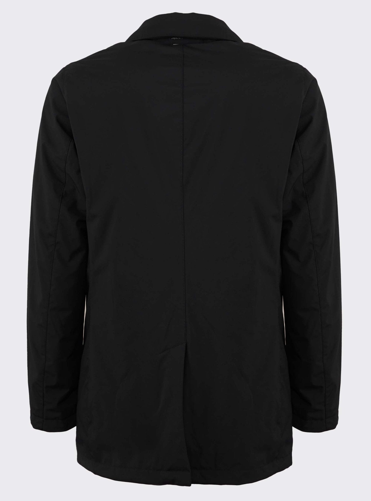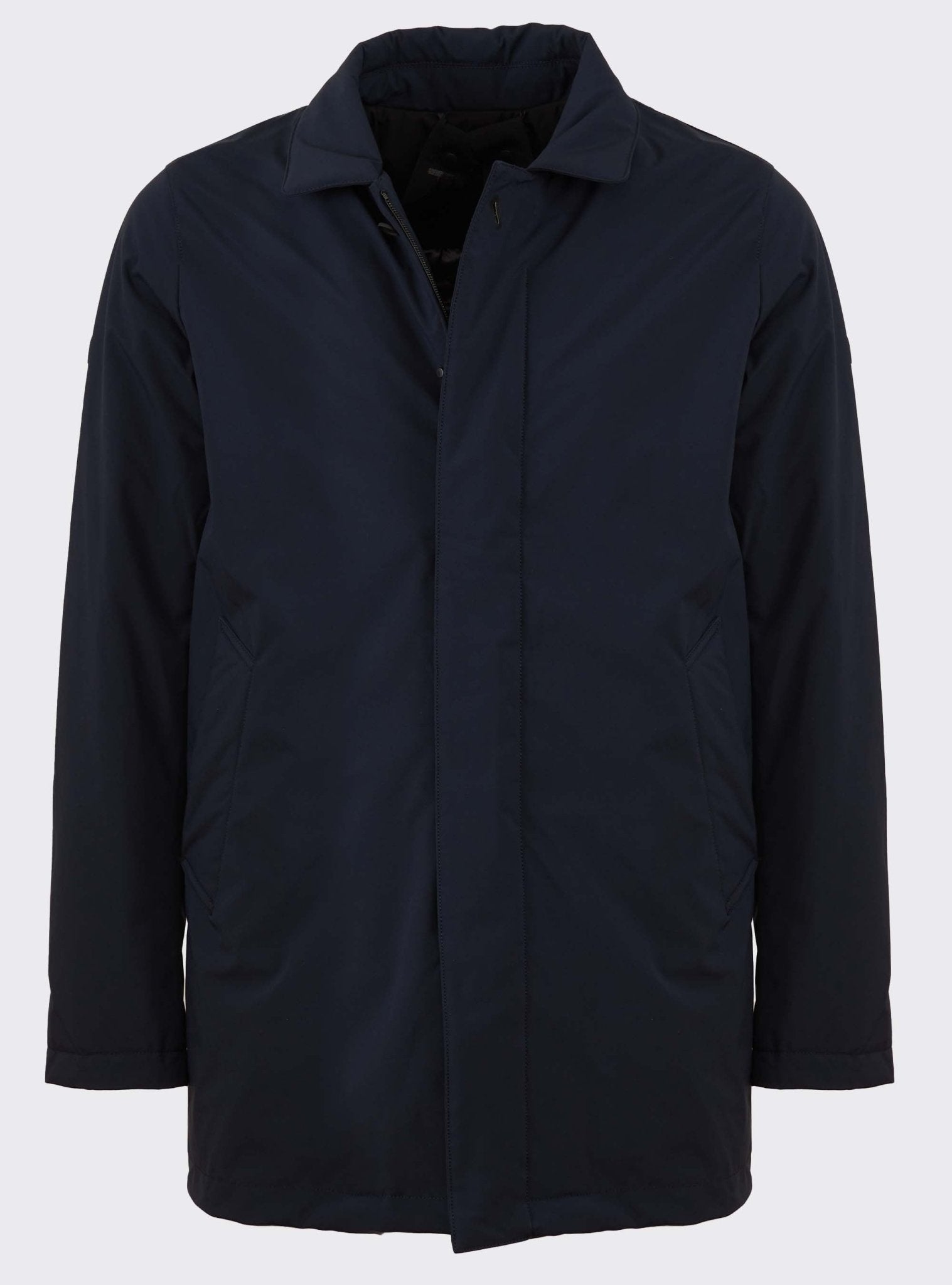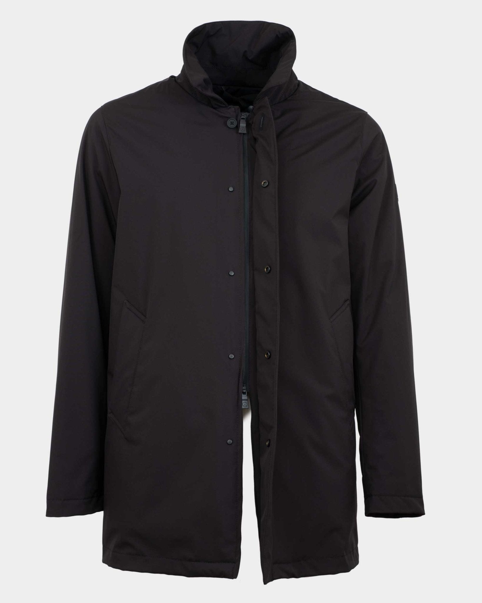 Double slider full zip closure with hidden buttons and double side pocket.