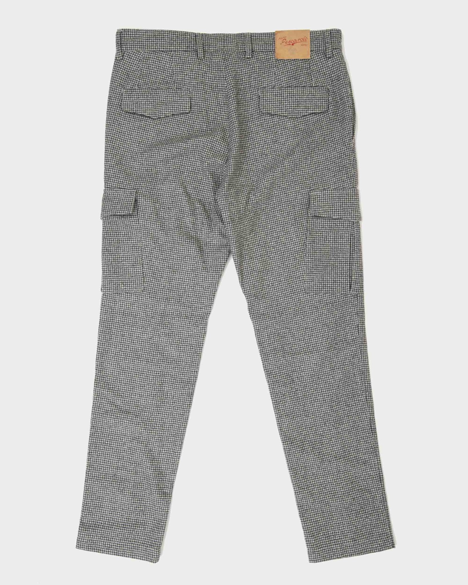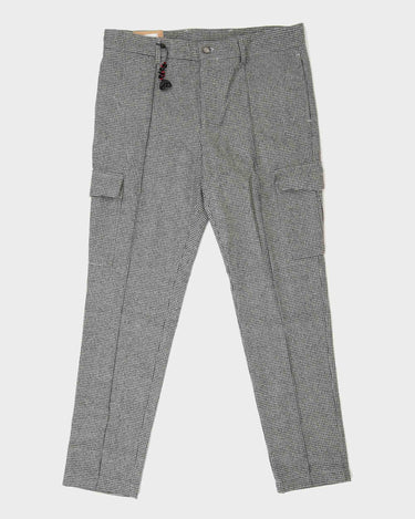 Zip and button fastening, welt pockets, two back pockets and cargo pockets.