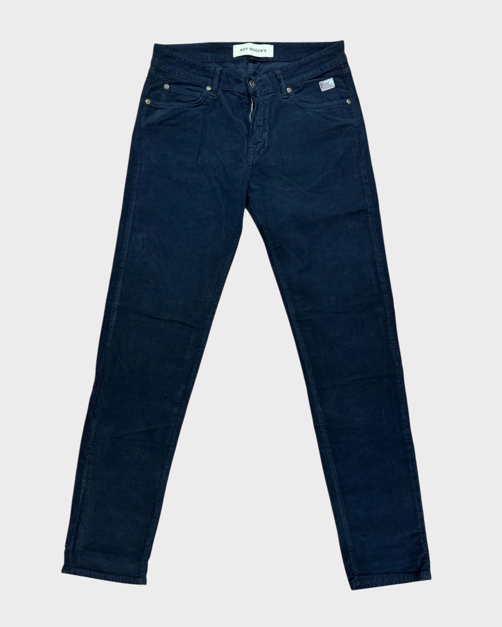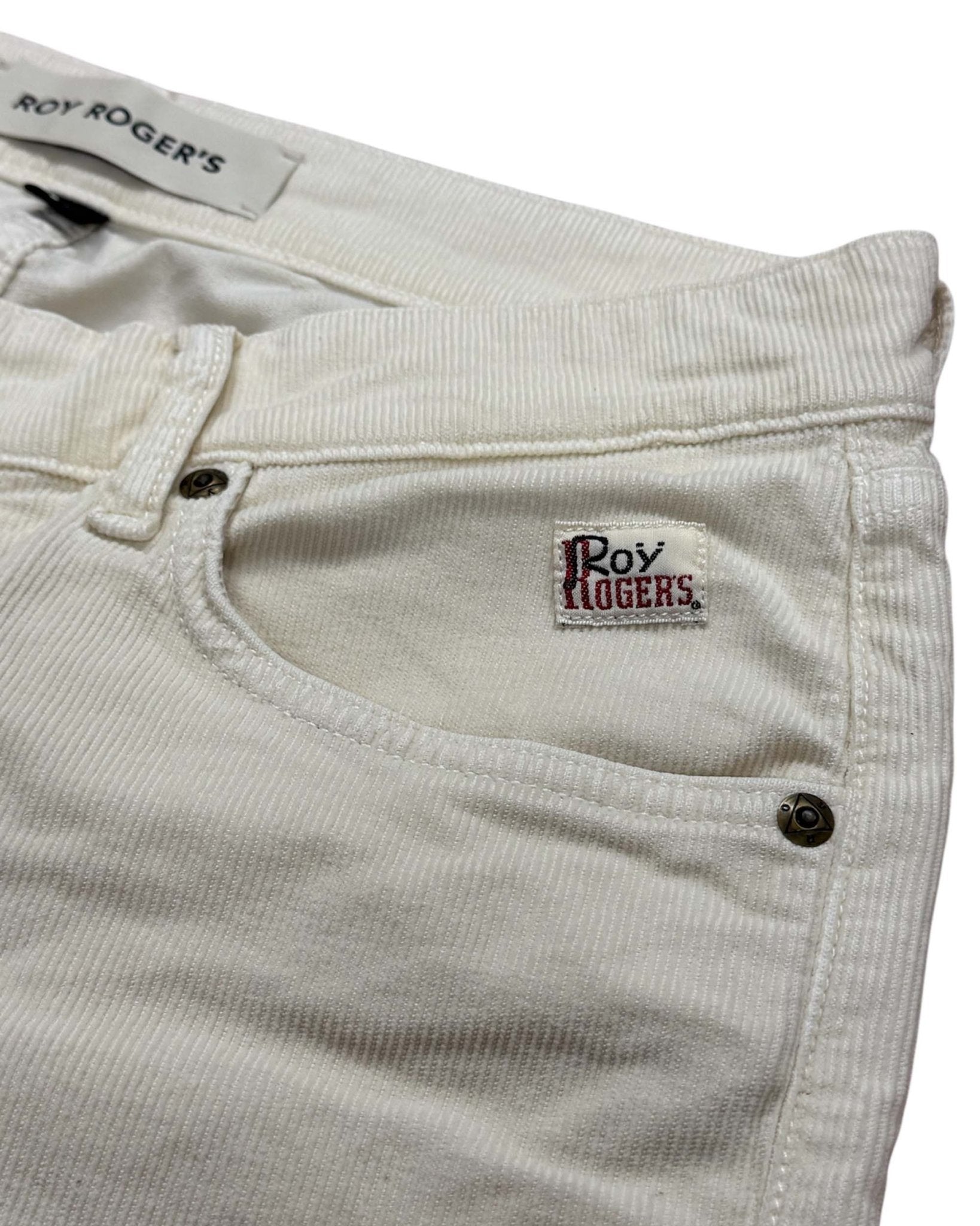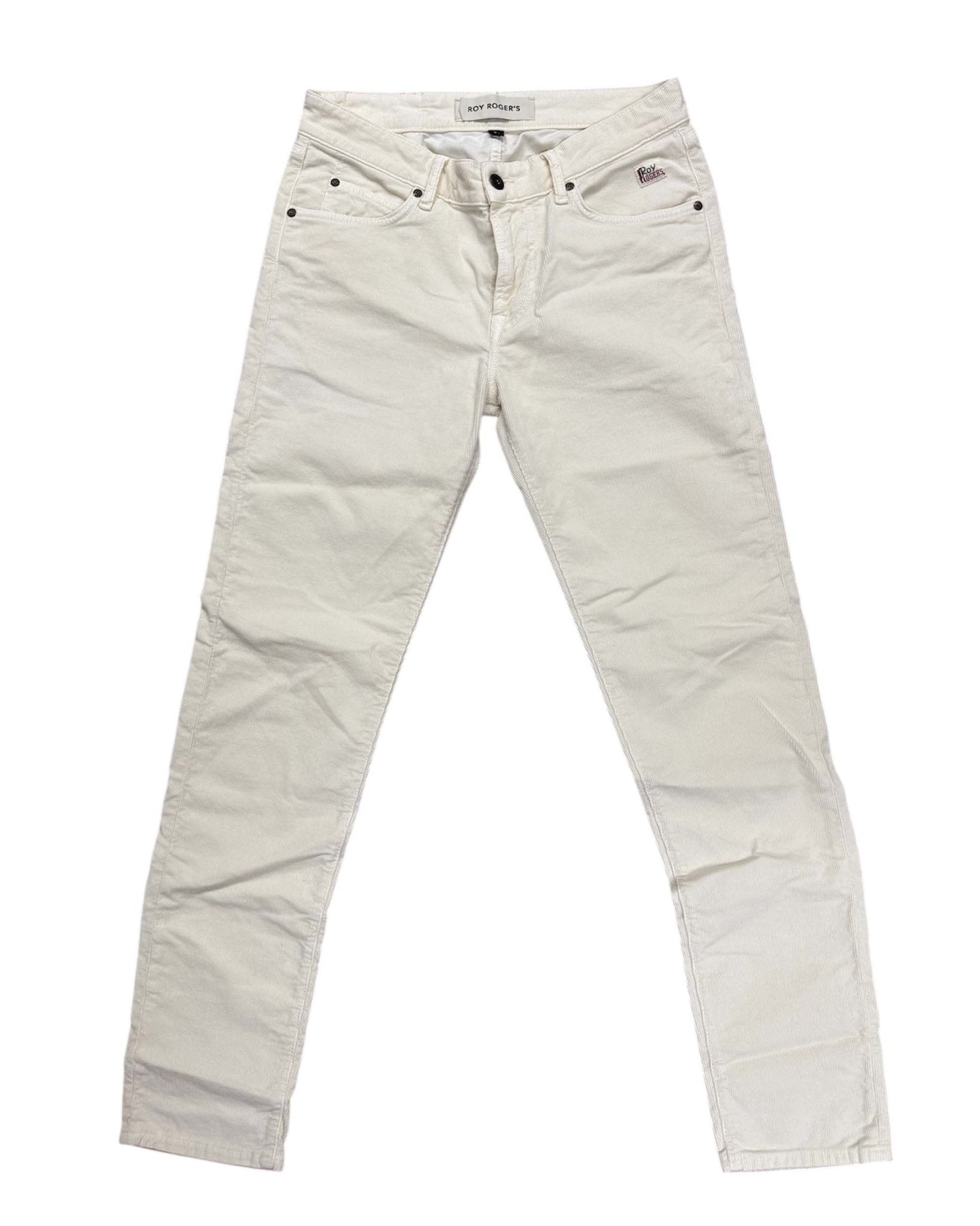 Vita media con passanti e salpa applicata sul retro. Chiusura con bottone logato e zip. Due tasche sul fronte e due tasche sul retro con label Roy Roger s applicato. Slim fit. Soft touch.