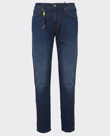 Jean en denim stretch délavé moyen. Taille haute avec passants pour ceinture et étiquette appliquée au dos. Deux poches avant et deux poches arrière avec étiquette Roy Roger appliquée. Fermeture par boutons logotés. Pendentif particulier suspendu à la boucle.