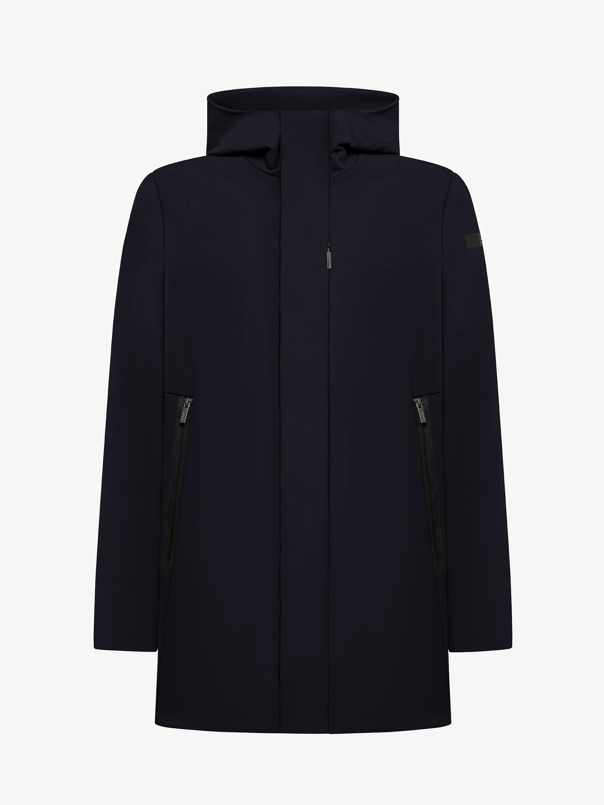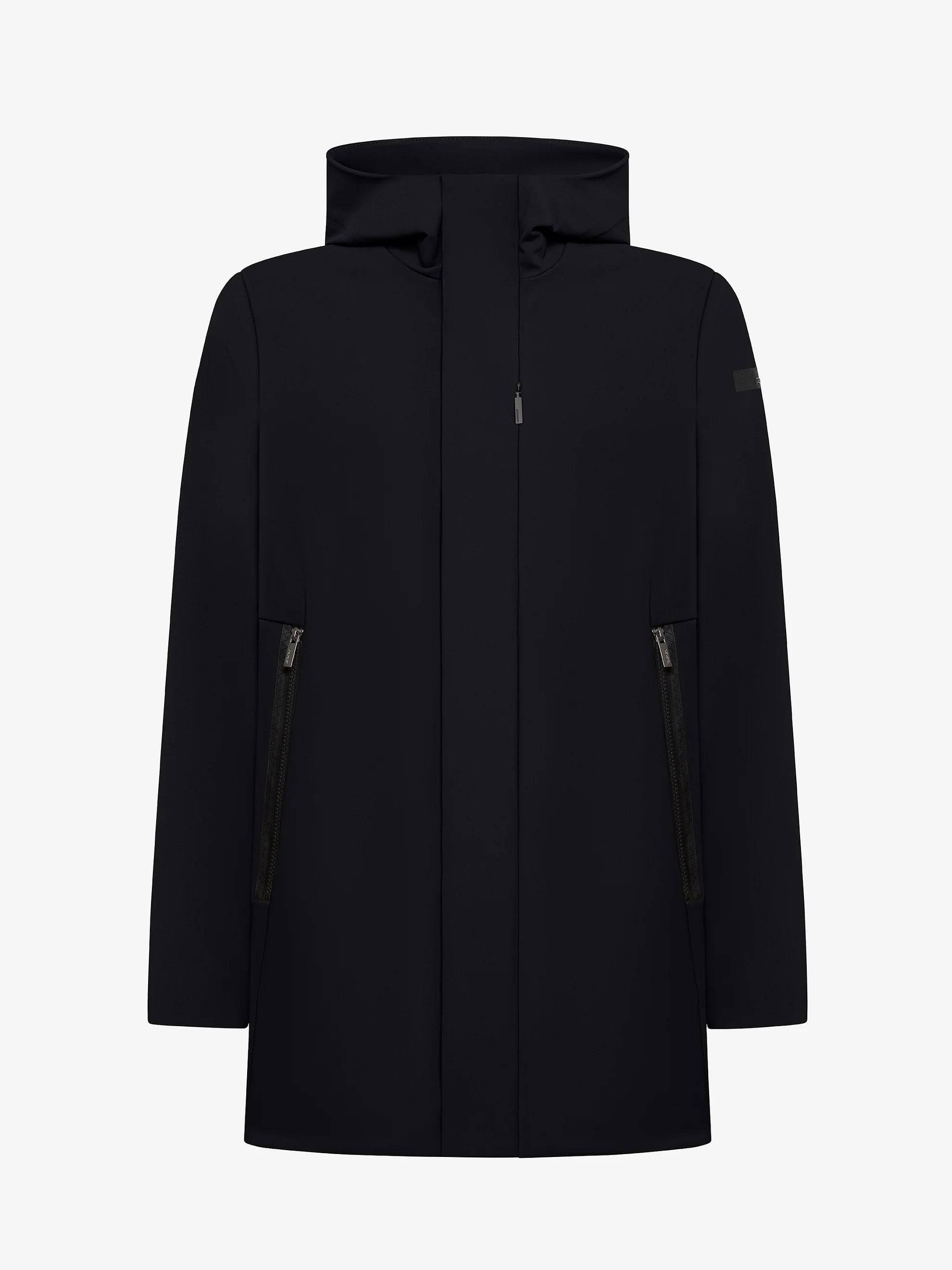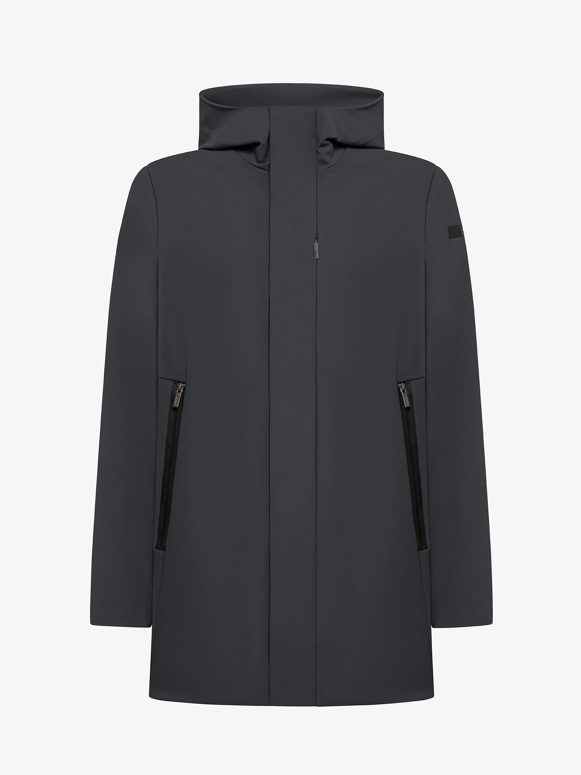 fit regolare - lunghezza media - linee minimaliste e contemporanee - tessuto a membrana impermeabile e traspirante, elasticizzato e super opaco - cappuccio fisso - patta frontale con bottoni a pressione invisibili - zip integrale a doppio cursore - ampie e comode tasche laterali - interno foderato in pregiato velluto con taschino chiuso dalla zip invisibile.