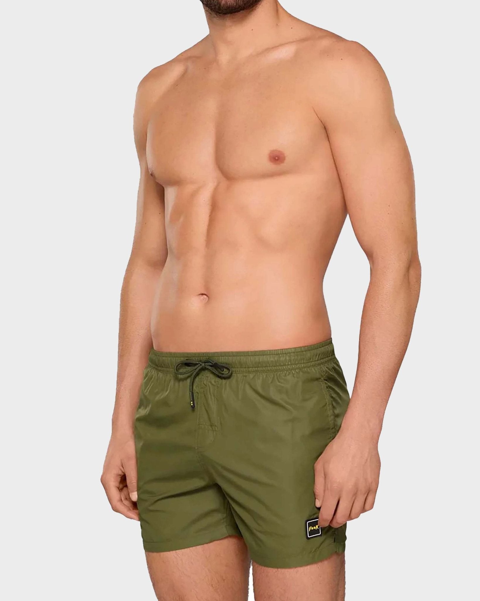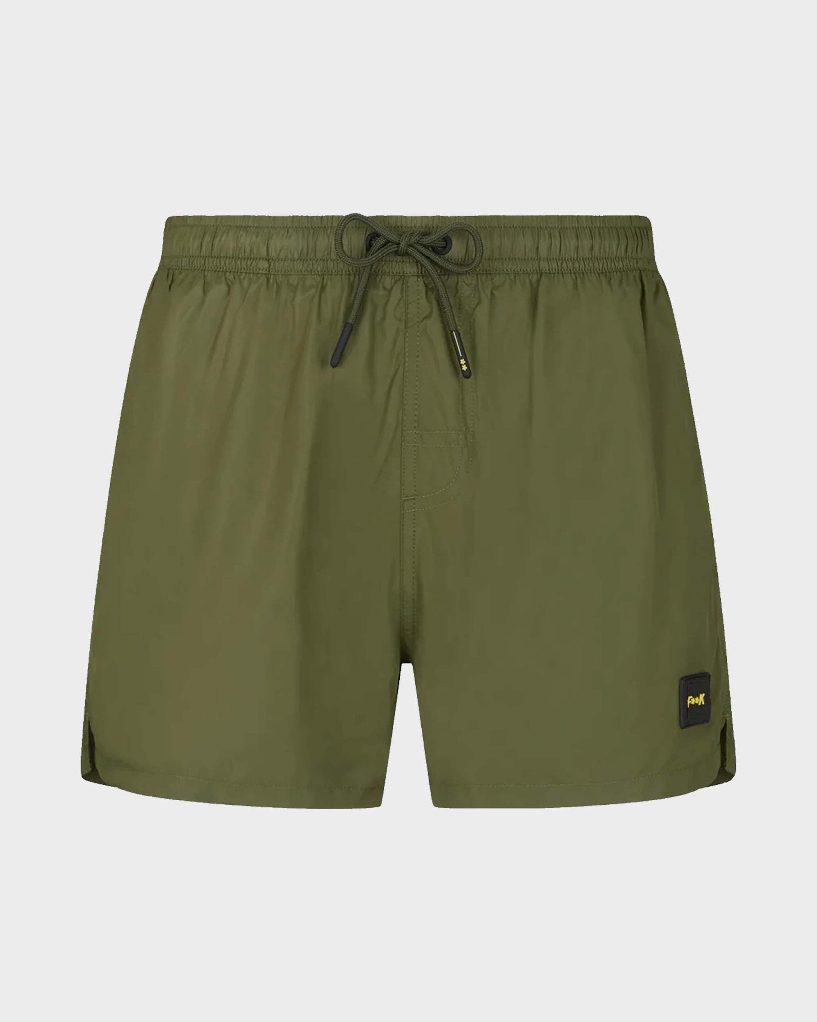 Fresh and shiny fabric, double welt pocket and back pocket with velcro closure. Elasticated waist with drawstring and F**K logo applied on the thigh.