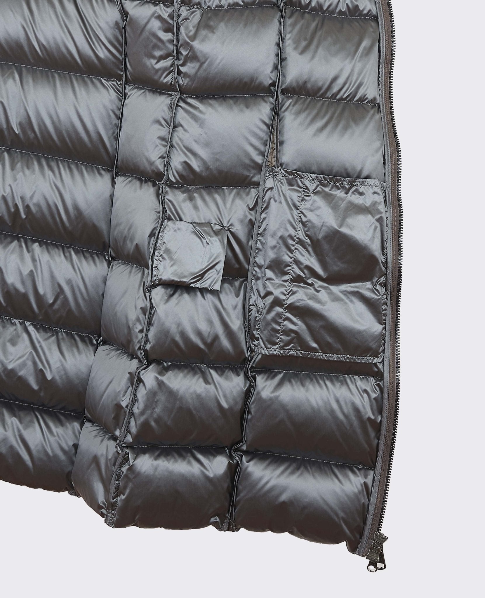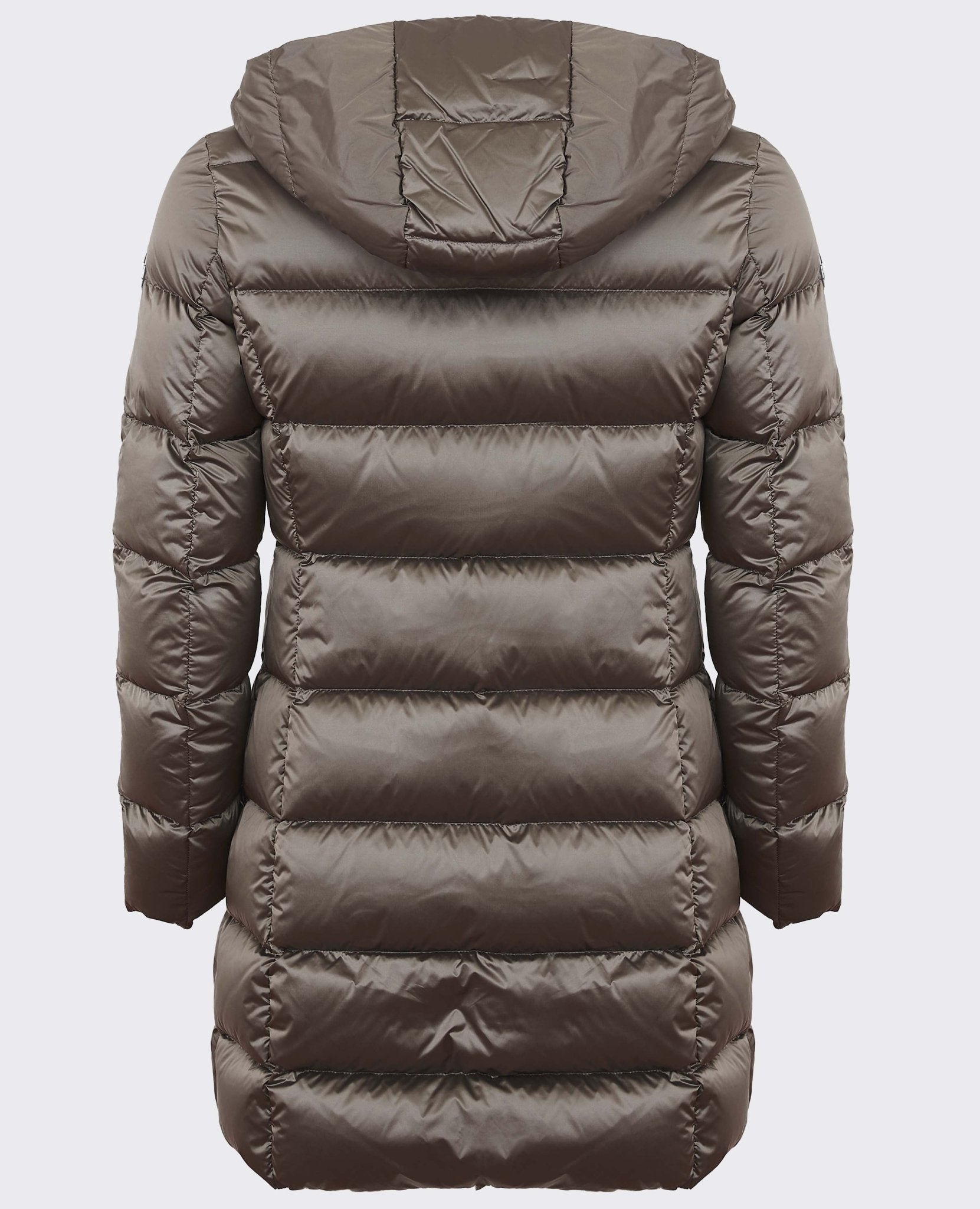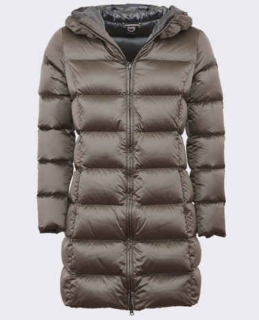 Doudoune à capuche fixe, réalisée en tissu déperlant irisé et rembourrée de plumes naturelles. Capuche enveloppante, matelassage régulier et une légère découpe latérale à la taille pour souligner la silhouette pour un look d'hiver vraiment féminin.