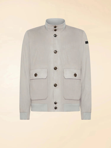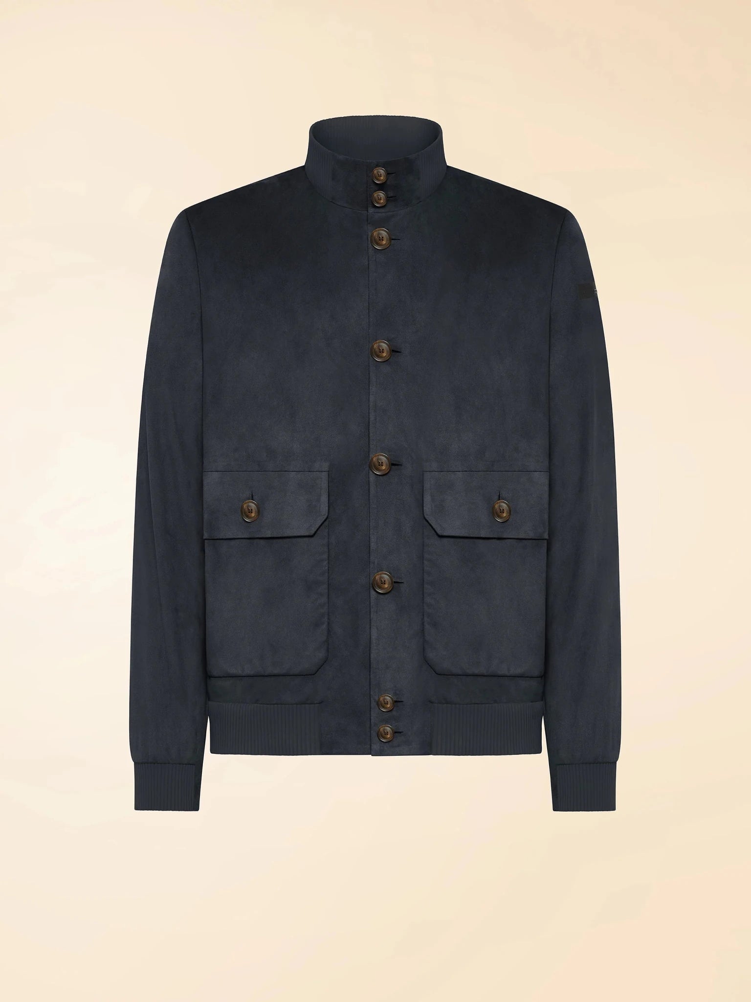Suede bomber jacket with button closure, double front pocket, and elasticated waist and cuffs.