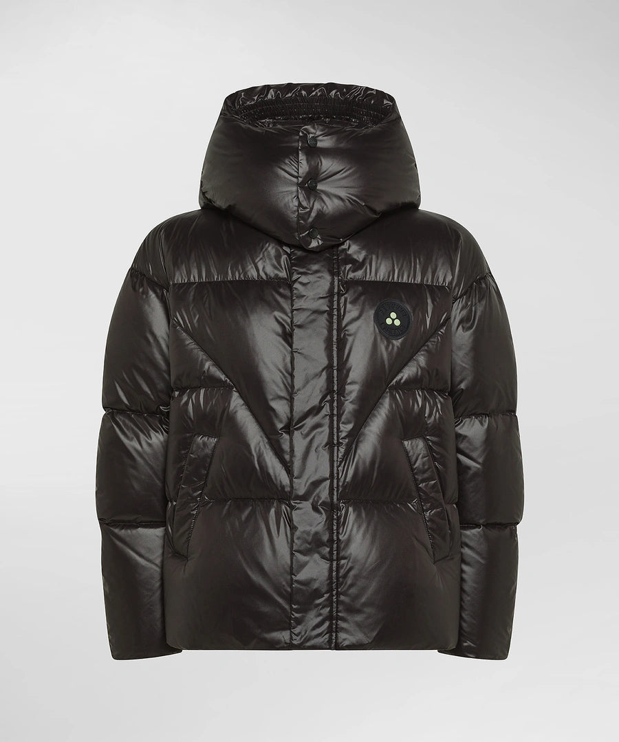 Personalizzazione tonda con logo - Trattamento idrorepellente PFC free - Cappuccio con bottoni a pressione - In nylon lucido - Resistente al vento - Imbottitura in piuma naturale certificata.